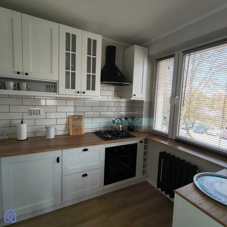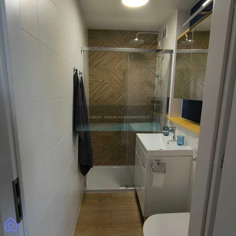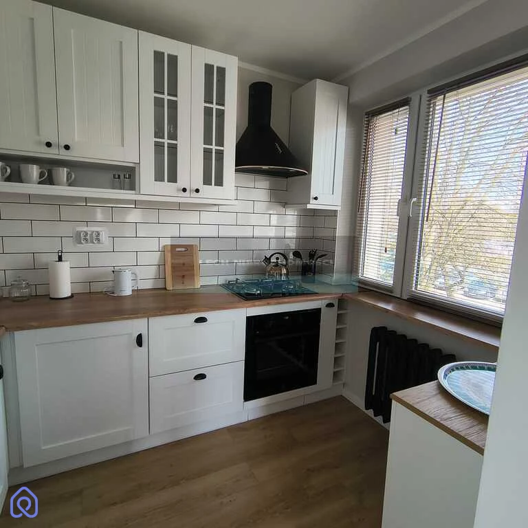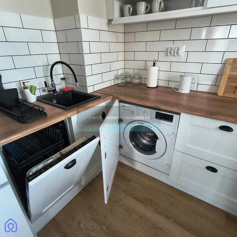 W kuchni meble wykonane na wymiar, nowy sprzęt AGD (pralka, lodówka, zmywarka, piekarnik). W łazience prysznic. W pokoju i przedpokoju pojemne szafy. Mieszkanie w stanie do wprowadzenia.