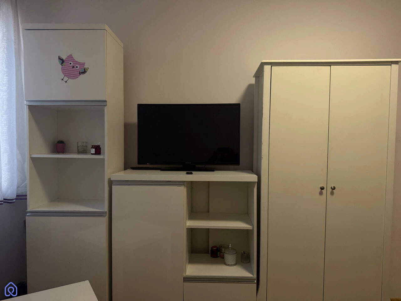 pokój z rozkładaną sofą, stołem, krzesłami, szafą i TV,