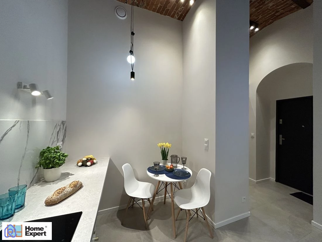Wysokie pomieszczenia (3,61 m) dają poczucie przestronności, a ceglany sufit nadaje wnętrzu wyjątkowego klimatu.