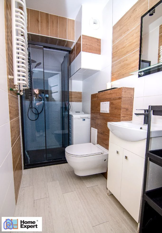 Wyposażenie: Łazienka: prysznic, toaleta typu Geberit, pralka z wkładem od góry, umywalka, lustro. Kuchnia: AGD w zabudowie - lodówka, zmywarka, płyta indukcyjna oraz mały piekarnik.