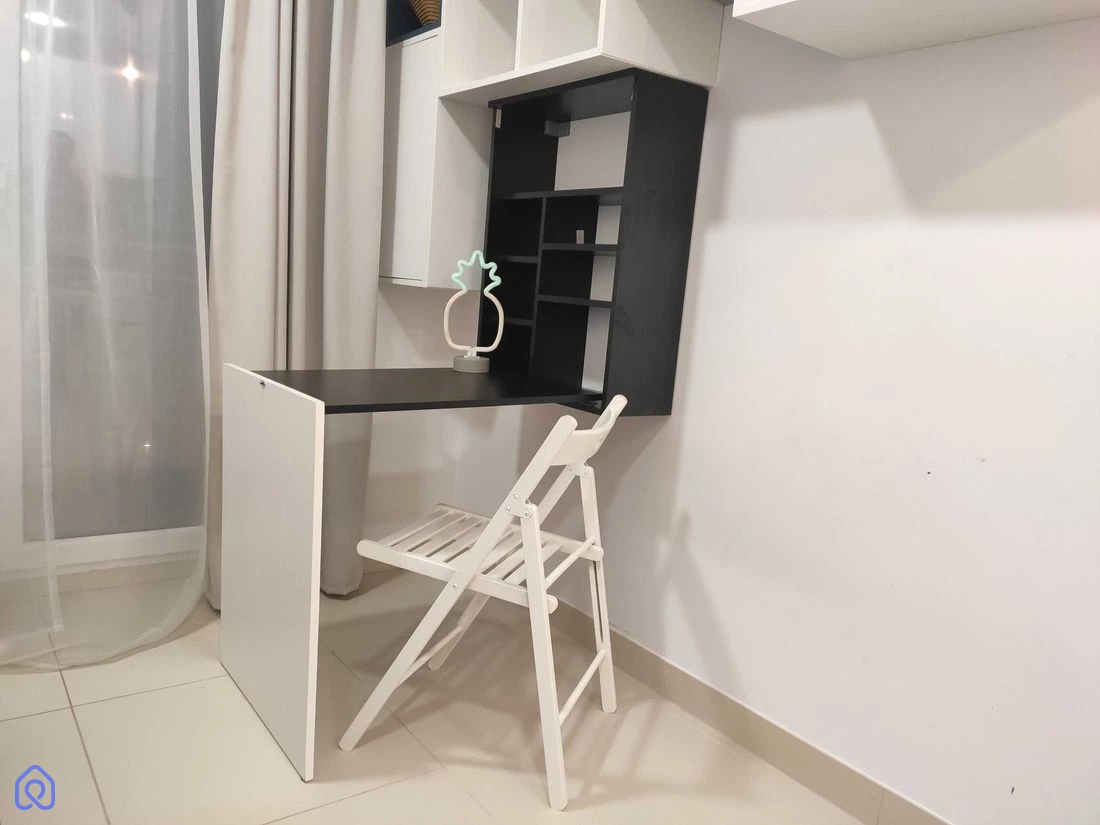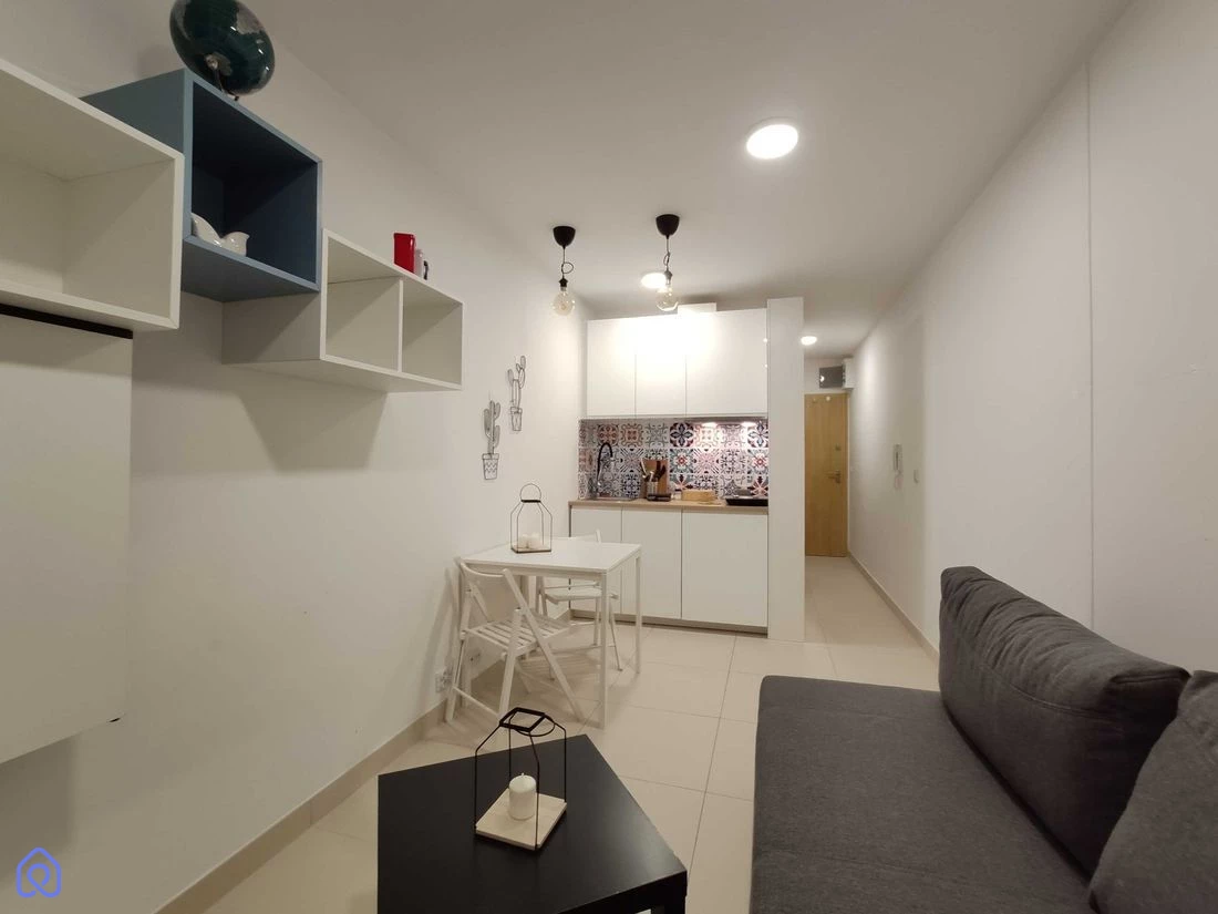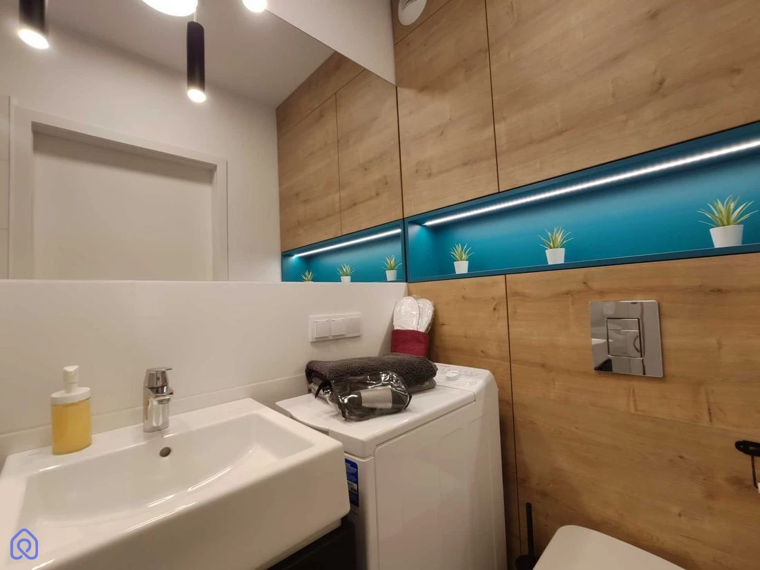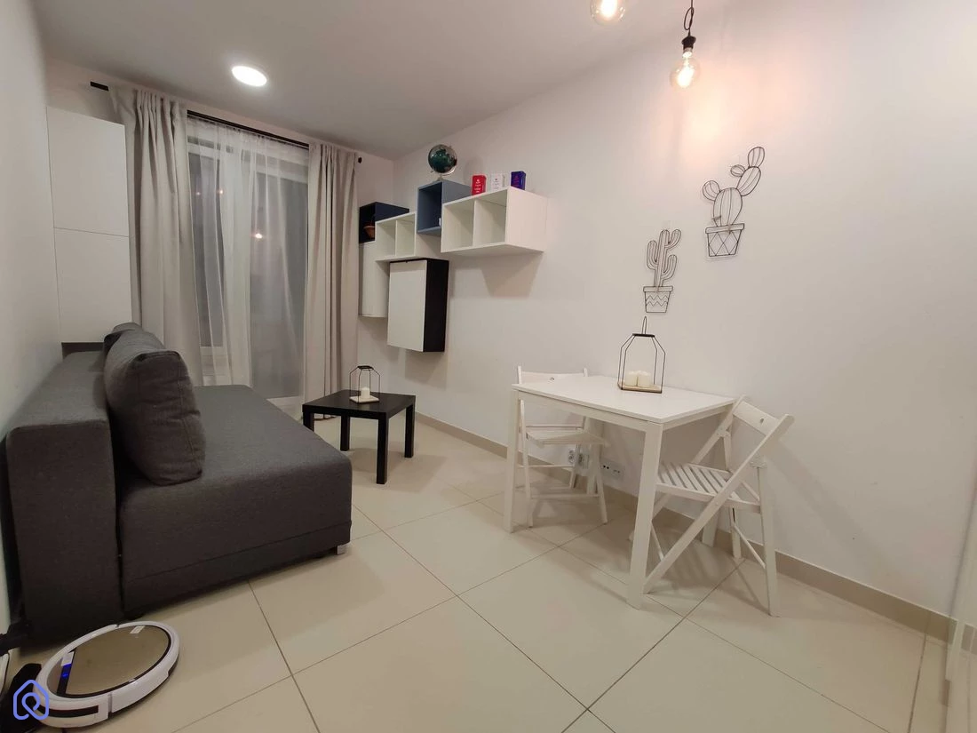 Pokój: W pełni umeblowany i wyposażony – wersalka, biurko, szafa, stół itp. • Kuchnia: Kuchenka indukcyjna, zmywarka, lodówka, meble kuchenne • Łazienka: Prysznic, pralka Mieszkanie znajduje się w nowoczesnym budynku z 2019 roku, wyposażonym w system rekuperacji, który dostarcza świeże filtrowane powietrze, chłodzi latem i ogrzewa zimą. Media miejskie: Ciepła i zimna woda, kanalizacja, ogrzewanie c.o.