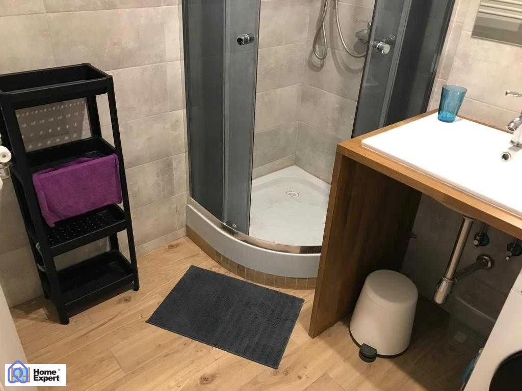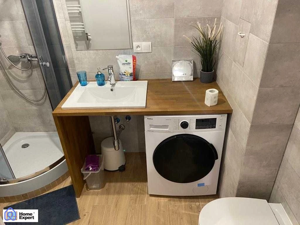 Przytulna łazienka oraz kuchnia wyposażone są w sprzęty, które ułatwiają codzienne życie. (pralka, kuchenka indukcyjna, kabina prysznicowa).