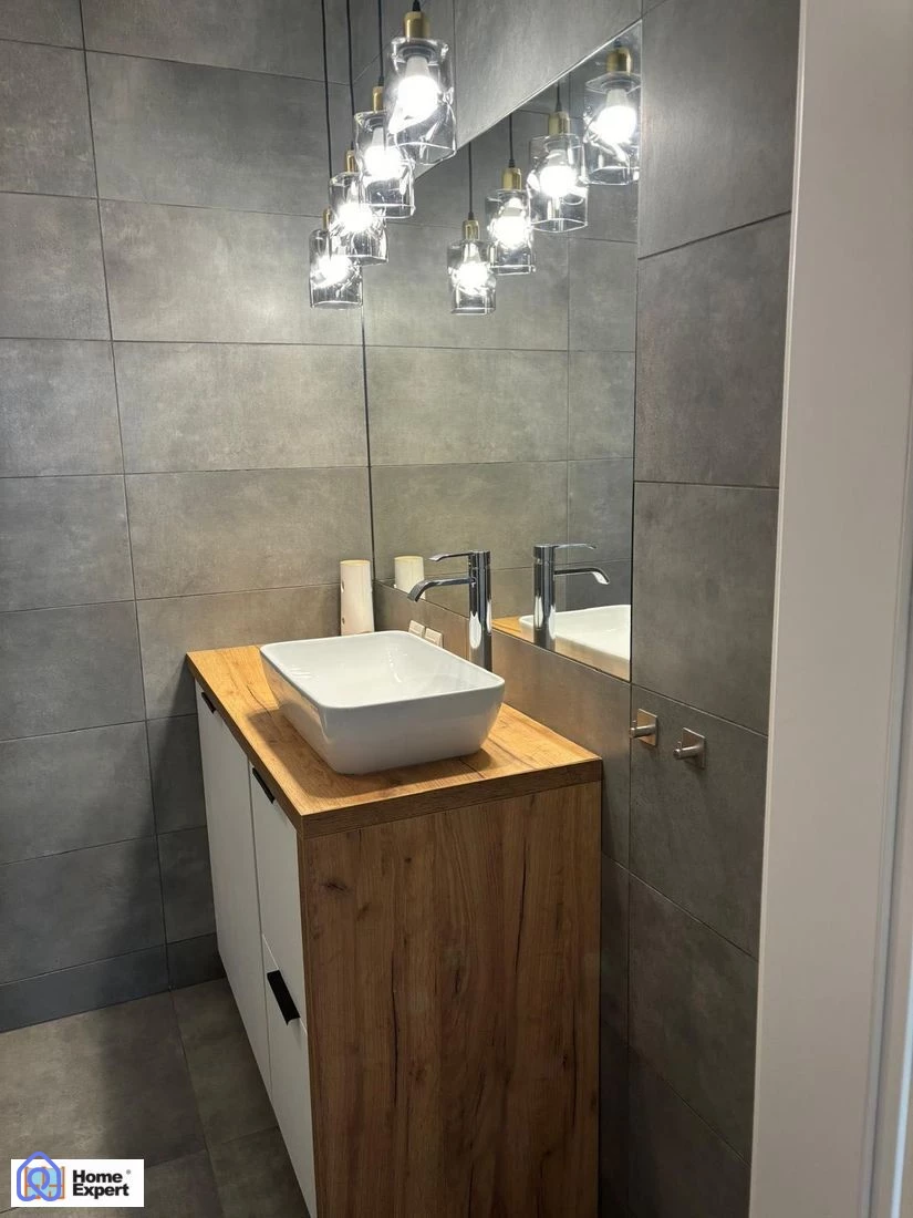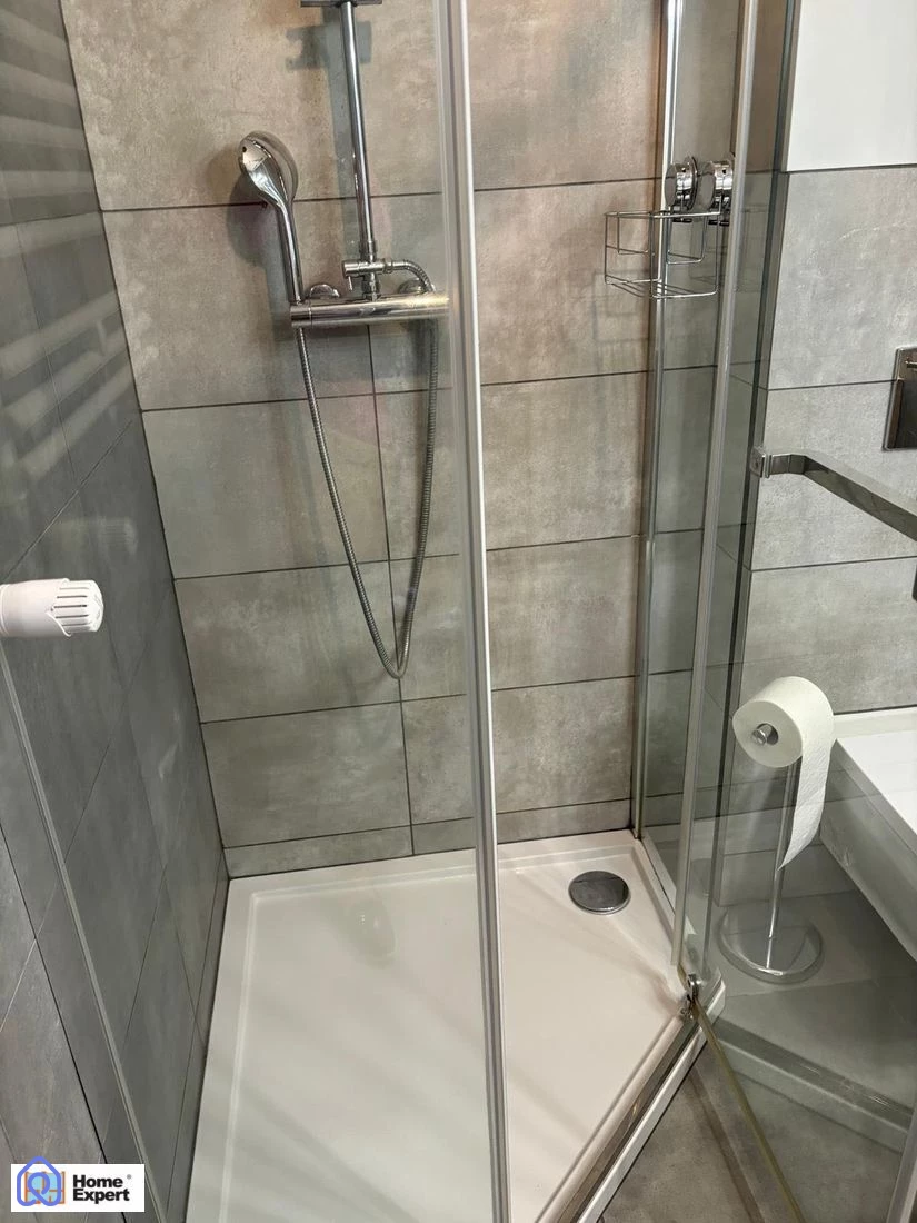 -prysznic z deszczownicą, pralka w zabudowie, 2 pojemne szuflady, szafka na środki czystości nad geberitem.