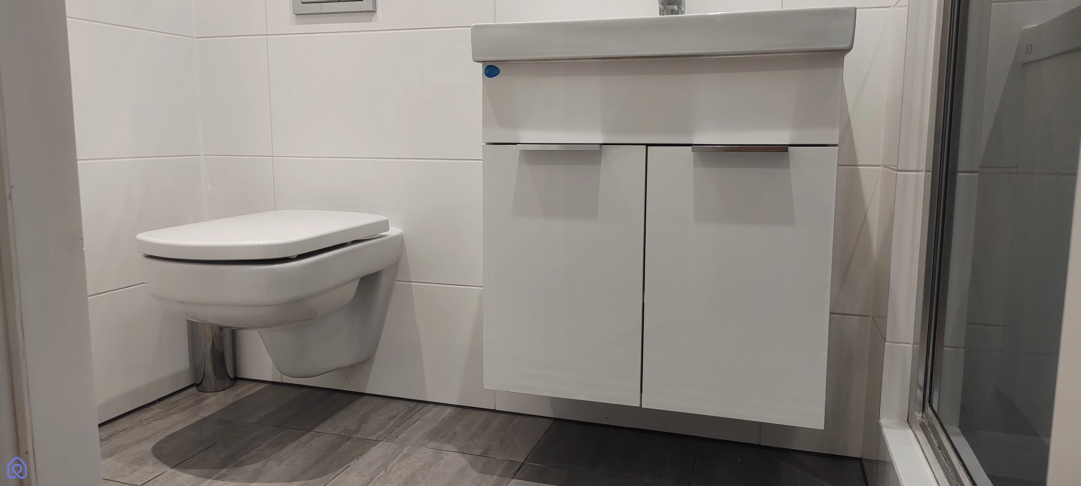 łazienka z prysznicem, umywalką i WC,