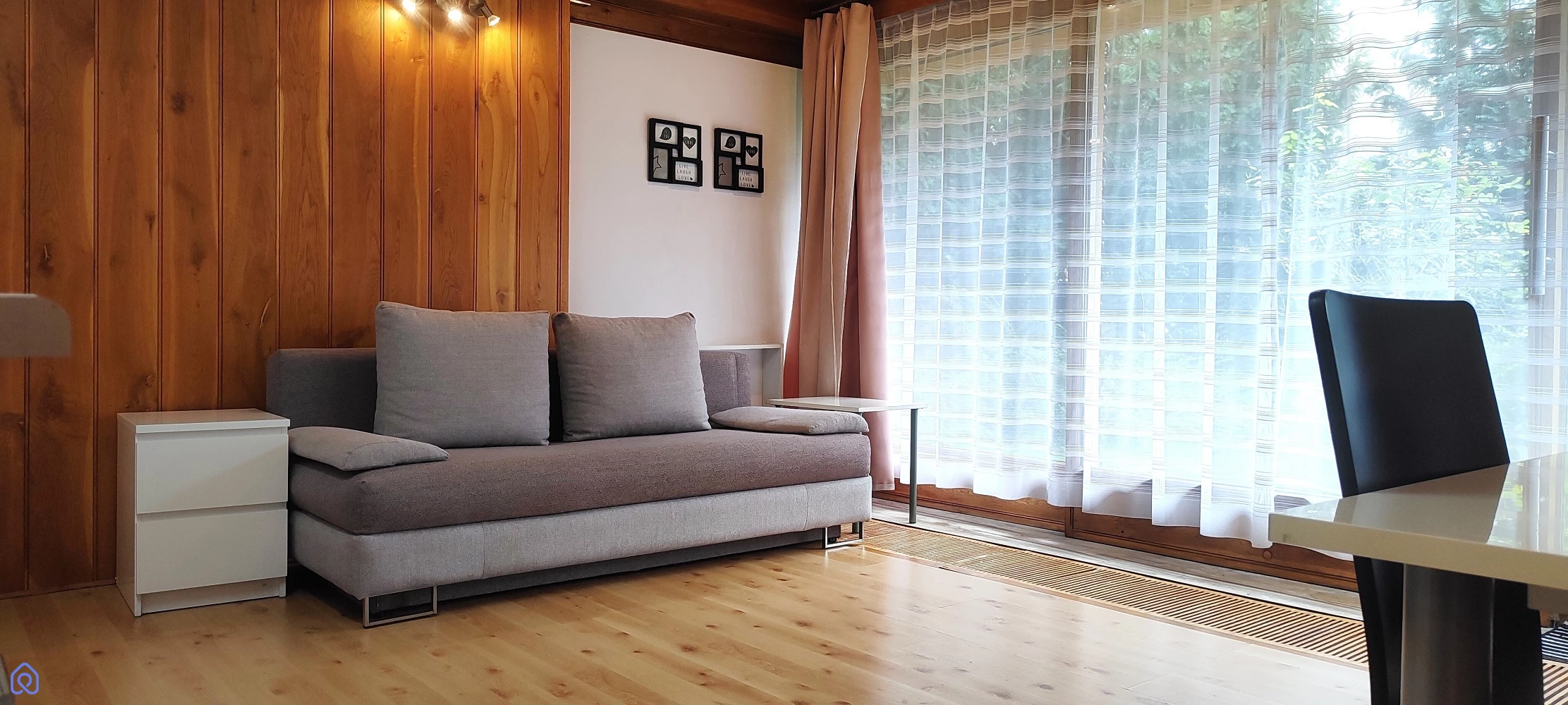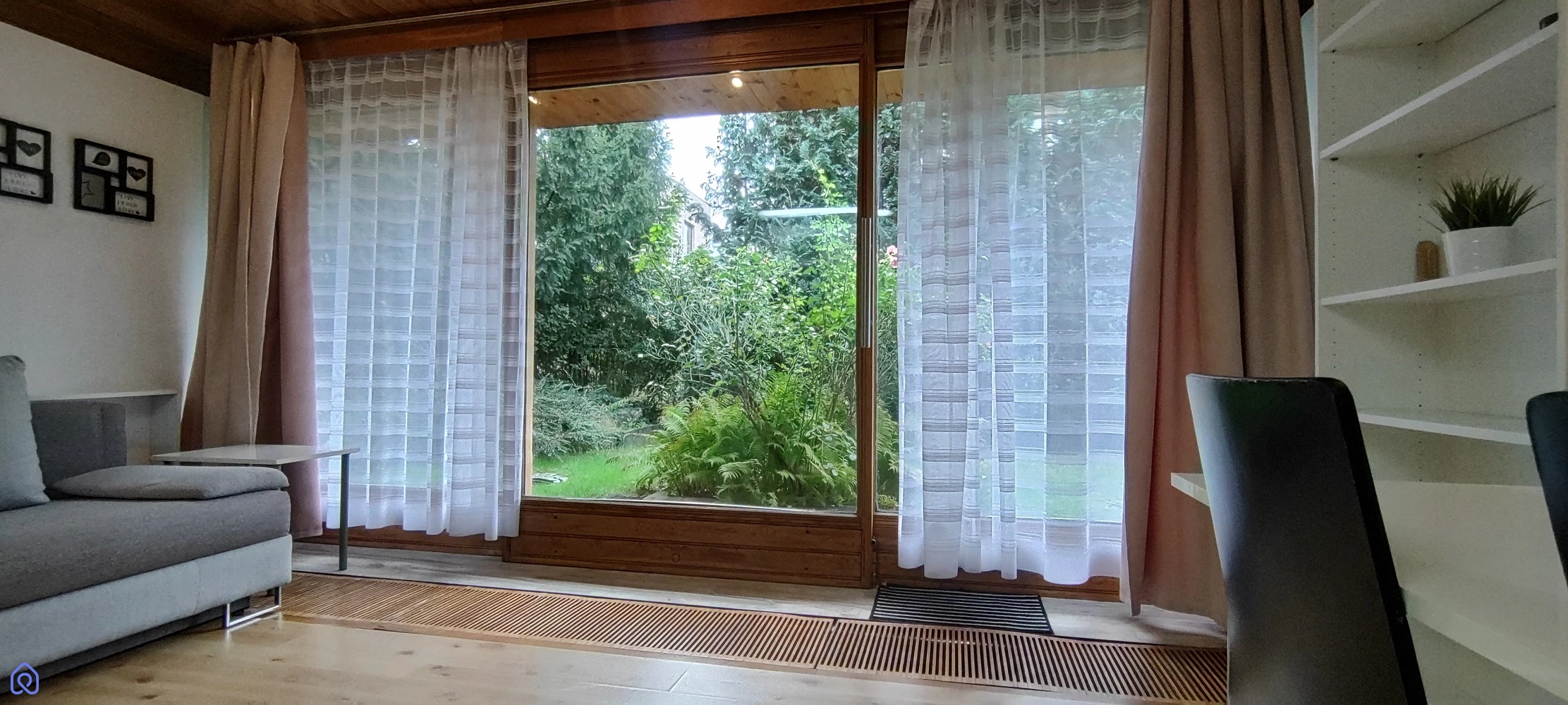 jasny pokój z przeszkloną ścianą i wyjściem na taras oraz ogród,