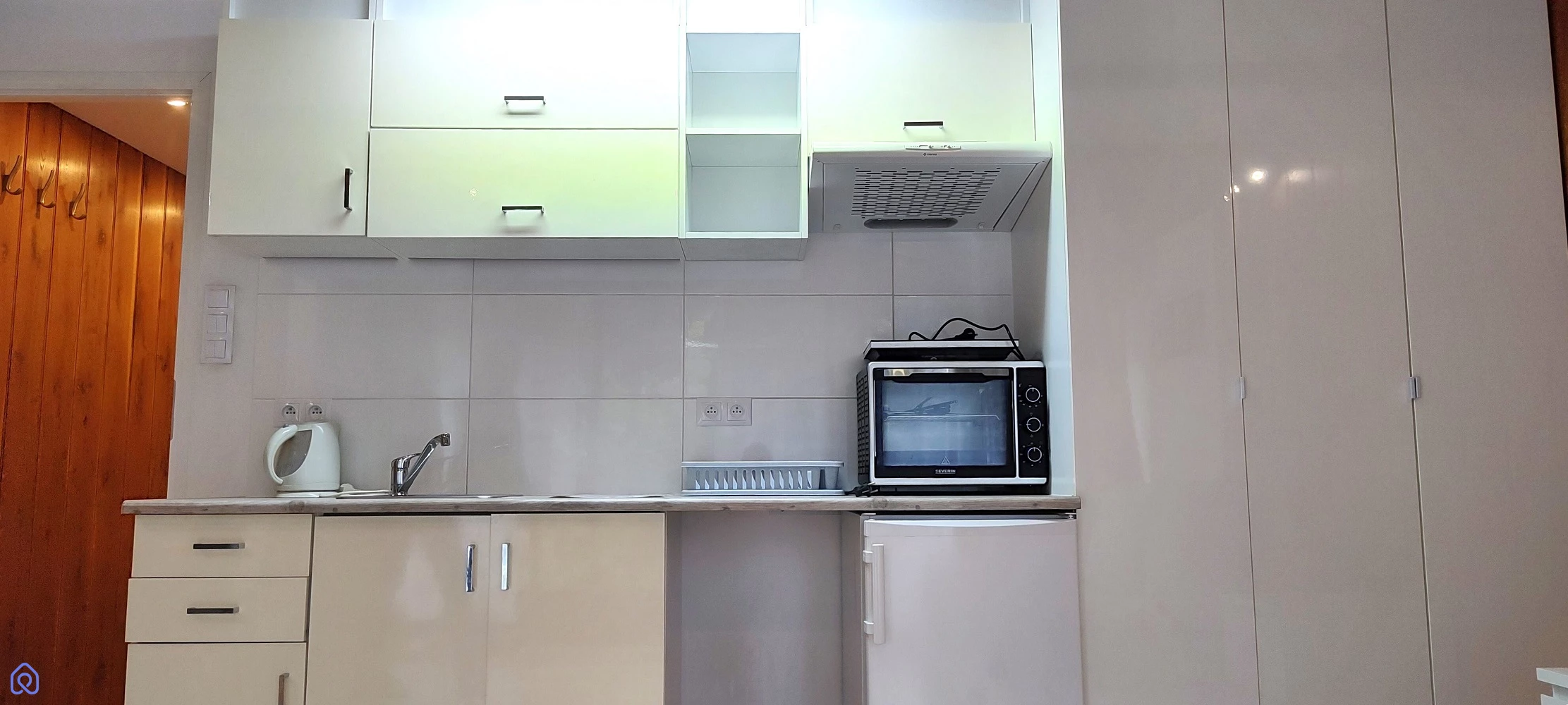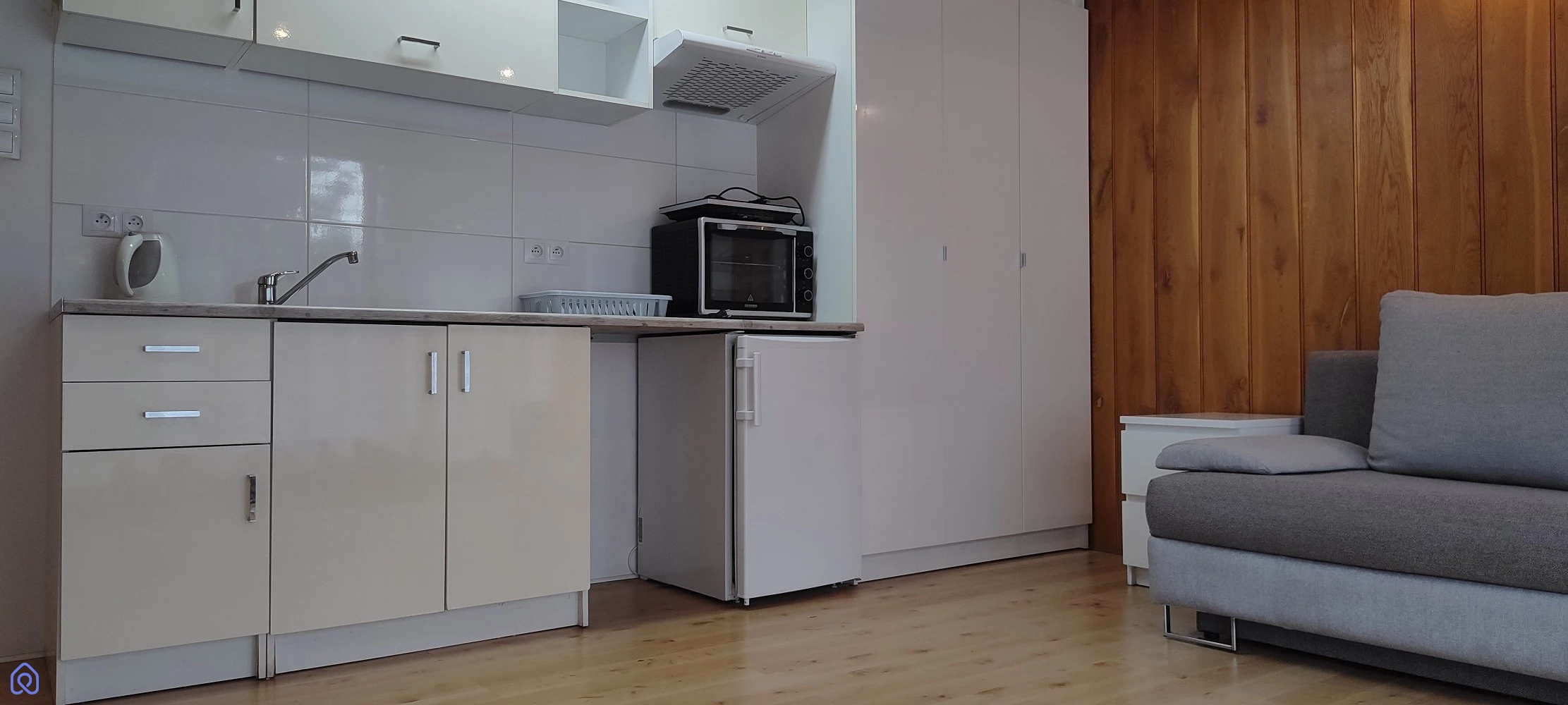 aneks kuchenny z lodówką, płytą indukcyjną, piekarnikiem elektrycznym, zlewem,