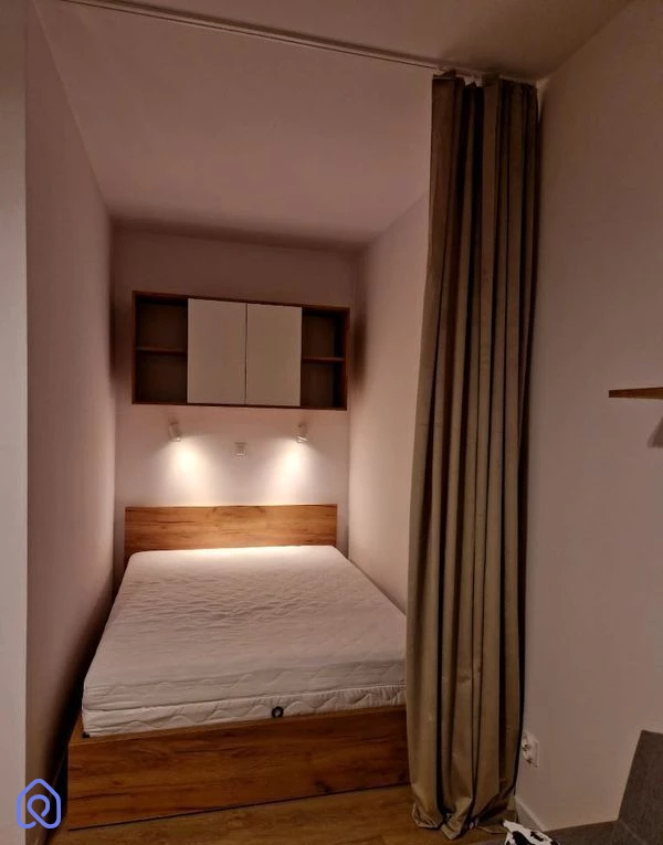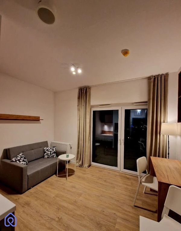Przestronny pokój/salon z wydzieloną sypialnią, balkonem, aneksem kuchennym, przedpokojem, łazienką.