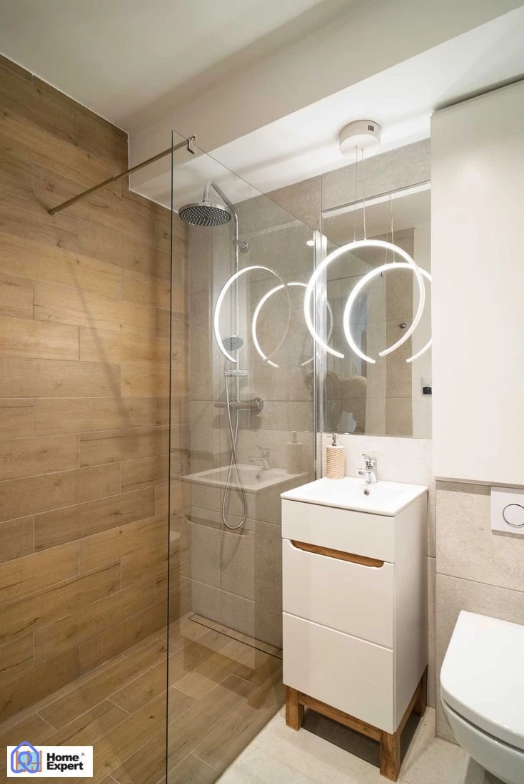 - Łazienka z dużym prysznicem, umywalką oraz szafkami do przechowywania.