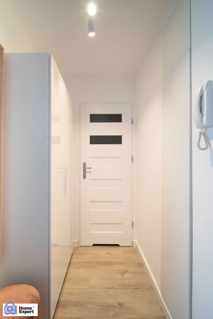 - Przestrzenny przedpokój posiada dużą szafę, wieszaki i lustro.