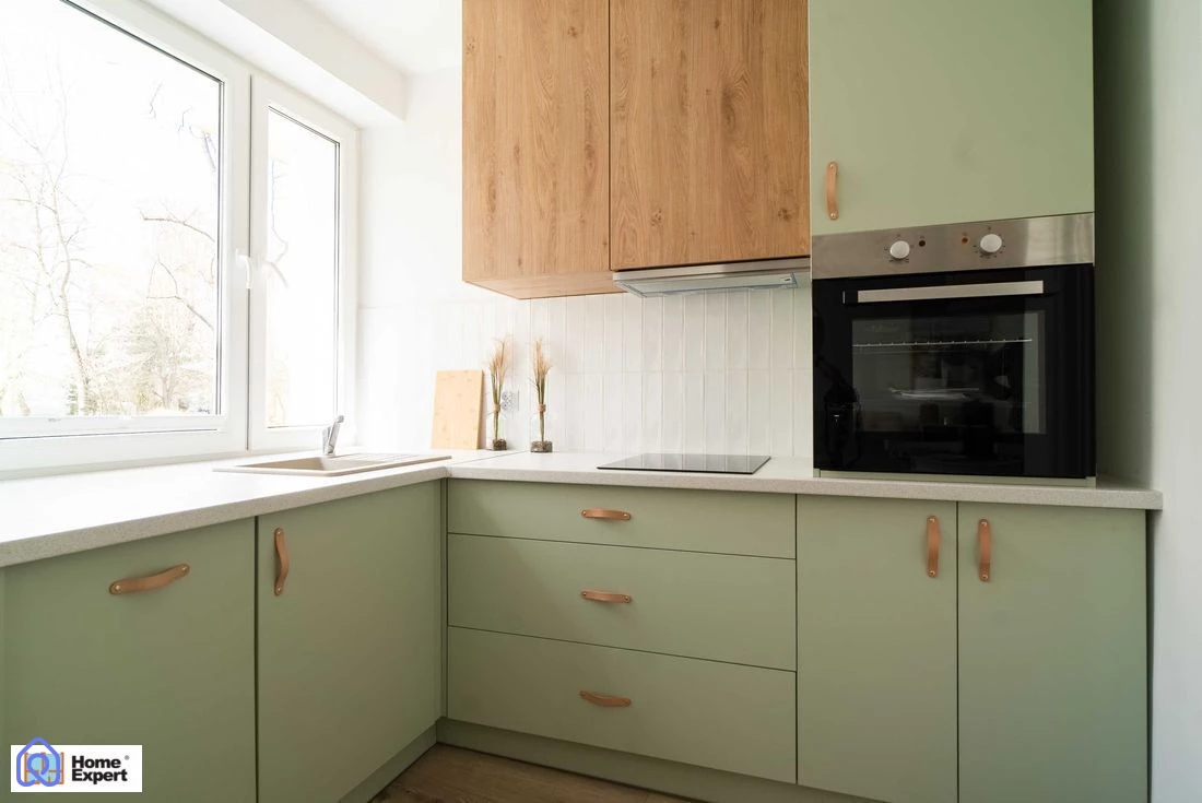 - Kuchnia wyposażona w meble wykonane na wymiar w nowoczesnym stylu. Wyposażona jest w lodówkę, pralkę, piekarnik, płytę grzewczą oraz zmywarkę.