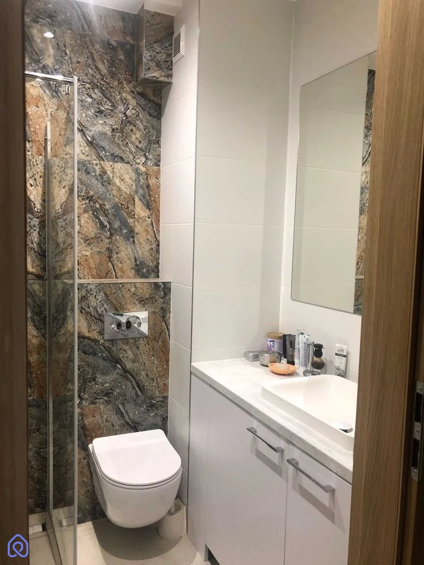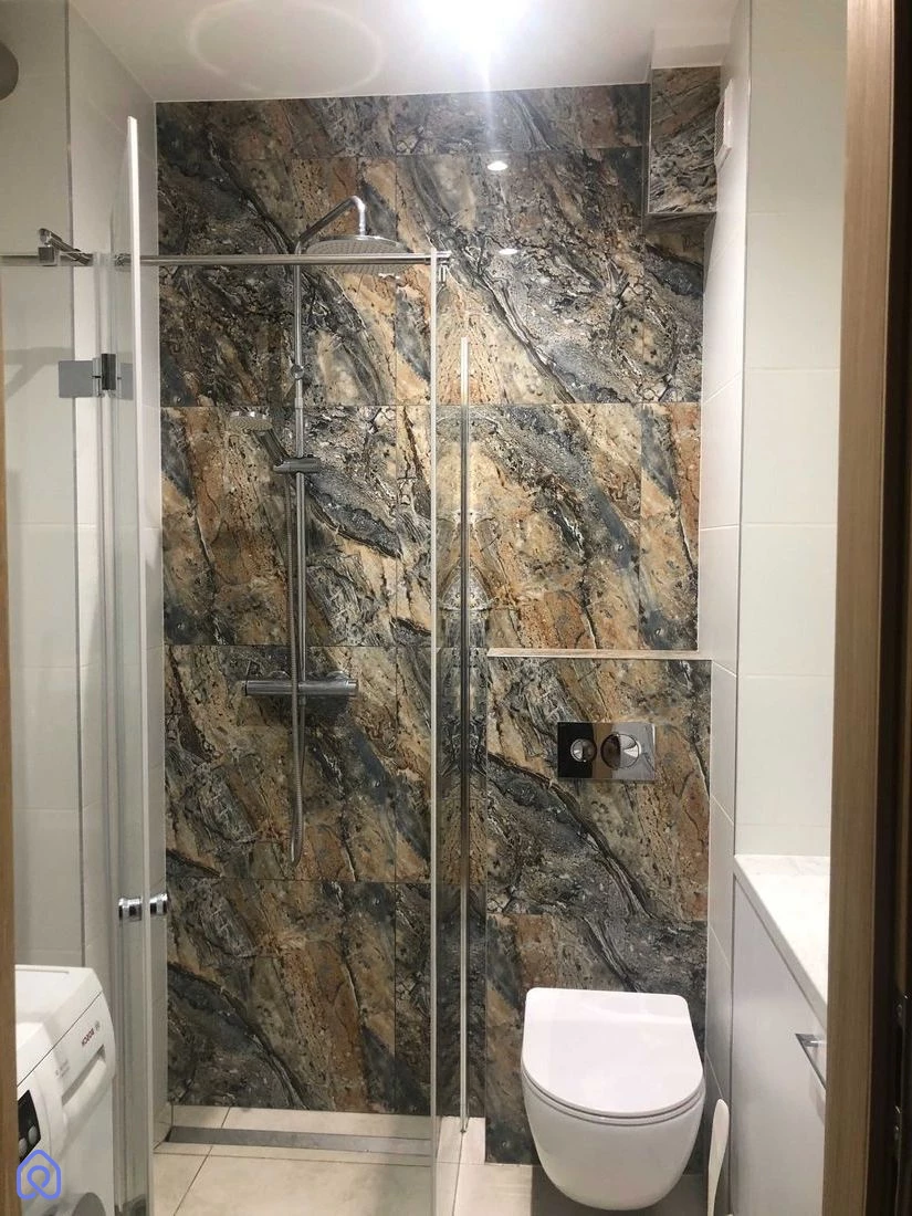 Łazienka z WC – kabina prysznicowa typu walk-in z deszczownicą, wejście z przedpokoju,