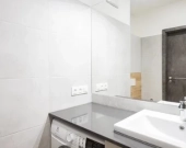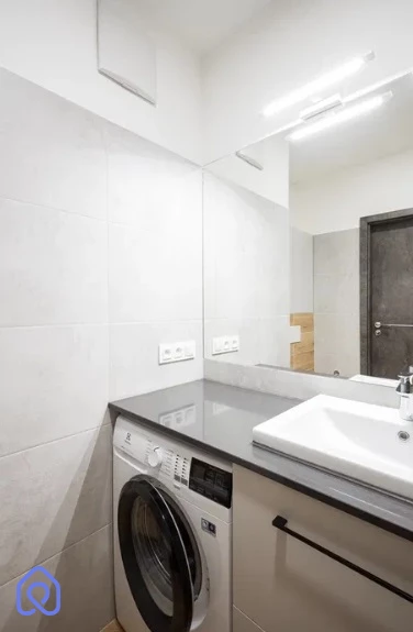 Łazienka wyposażona w pralkę, wannę ze szklanym parawanem , umywalkę oraz szafki w zabudowie na wymiar.