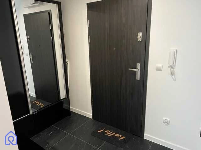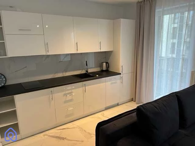 Kawalerka o powierzchni 26m2 z dużym balkonem 5m2 znajduje się na 1. piętrze. Składa się z przedpokoju z dużą szafą, łazienki z nowoczesną pralką (Whirlpool, baterie Grohe) i przestronnym prysznicem walk-in, salonu z aneksem kuchennym (lodówka z zamrażarką, płyta indukcyjna, okap, zmywarka marki Amica). W salonie znajduje się także wygodna, rozkładana sofa z pojemnikiem na pościel i komody do przechowywania.