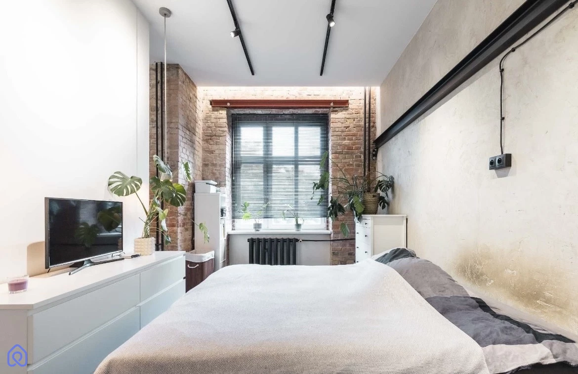 Przytulna sypialnia z dużym oknem, które zapewnia mnóstwo naturalnego światła.. Wnętrze jest urządzone w jasnych barwach, co dodatkowo potęguje uczucie przestronności.