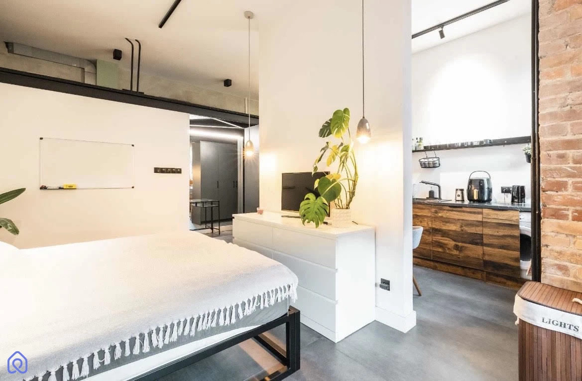 Przestronna kuchnia z wykończeniami z naturalnego drewna i nowoczesnymi urządzeniami AGD. Ściany z odsłoniętą cegłą nadają wnętrzu industrialny klimat, który idealnie współgra z minimalistycznym wykończeniem. Duża ilość miejsca do przechowywania oraz wygodne blaty robocze sprawiają, że kuchnia jest zarówno funkcjonalna, jak i estetyczna.