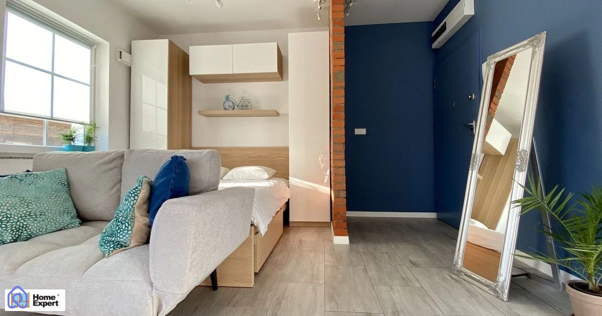 Można zaaranżować 2 pokoje, wydzielając małą sypialnię w miejscu, gdzie stoi łóżko.