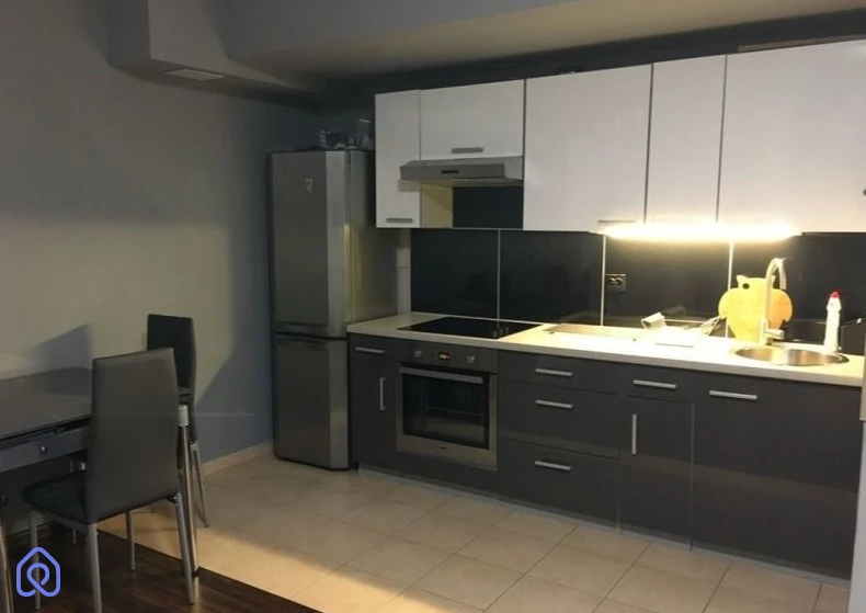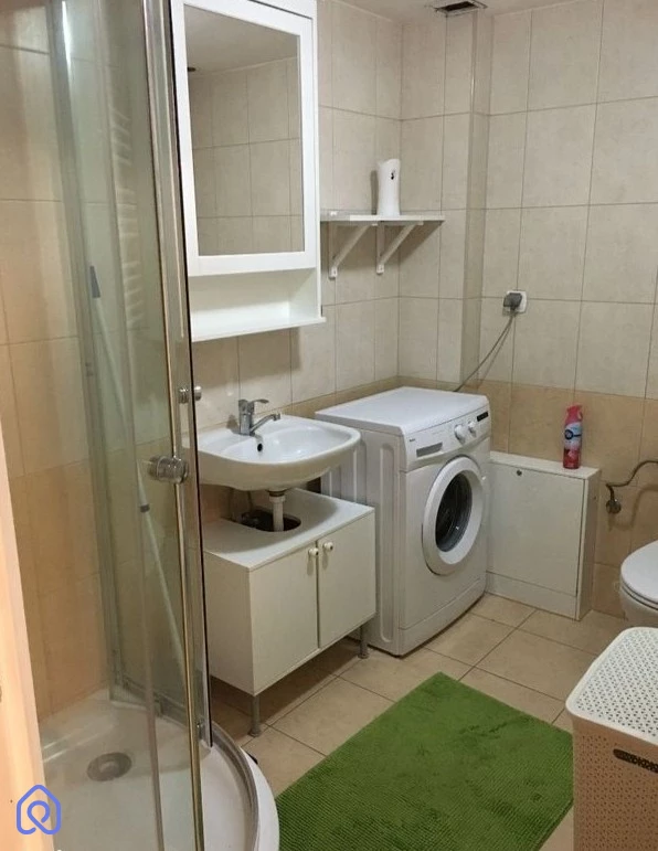 Kuchnia została wyposażona we wszystko, co potrzebne do codziennego gotowania – lodówkę, piekarnik, płytę grzewczą oraz zlewozmywak. Łazienka oferuje prysznic, pralkę, toaletę oraz umywalkę, zapewniając komfortowe warunki codziennego użytkowania.