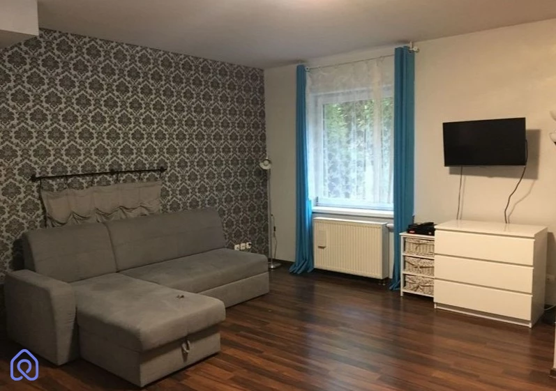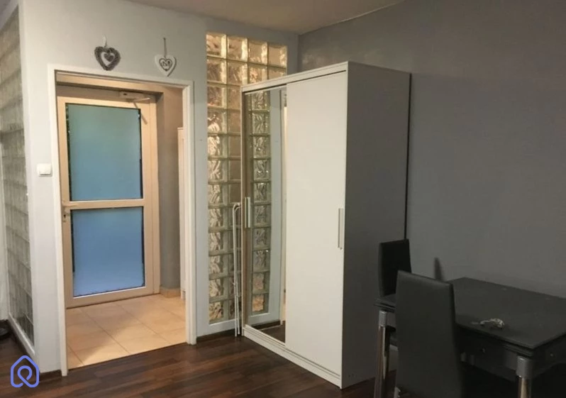 Przestrzeń przedpokoju została inteligentnie zagospodarowana w postaci szafy ubraniowej, zapewniając organizację przestrzeni. W salonie znajduje się wygodny narożnik z funkcją spania, szafa, komoda, rozkładany stół z krzesłami oraz telewizor, tworząc przytulne miejsce do odpoczynku i rozrywki.