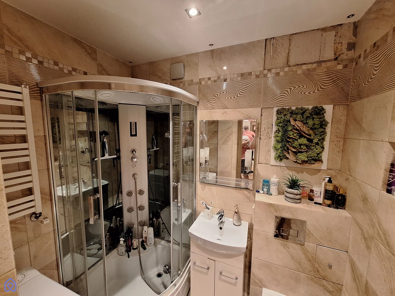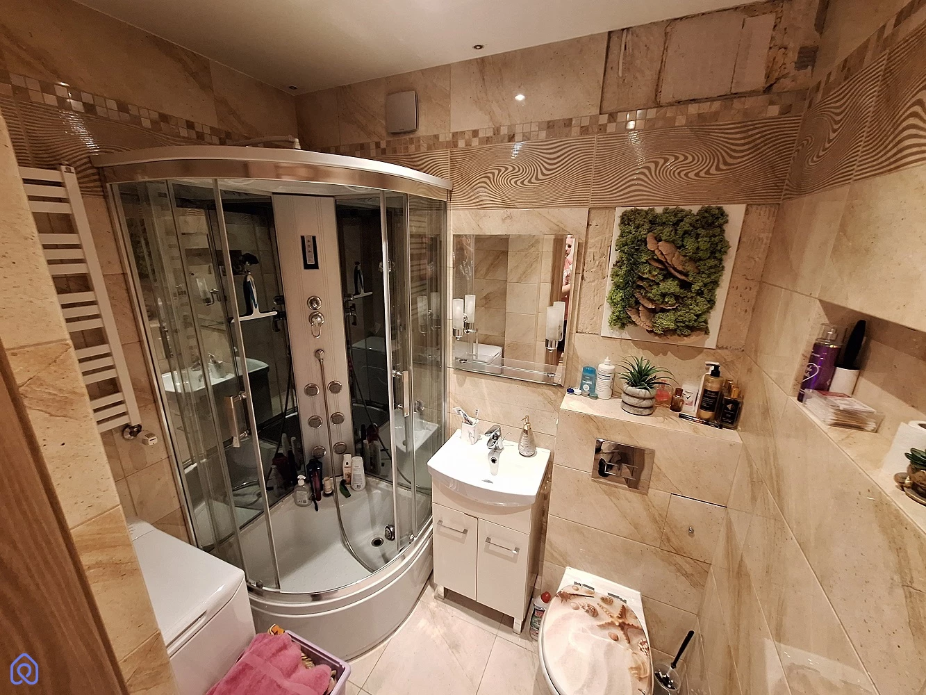 Nowoczesna łazienka z podświetlaną kabiną prysznicową z muzyką i wentylacją.