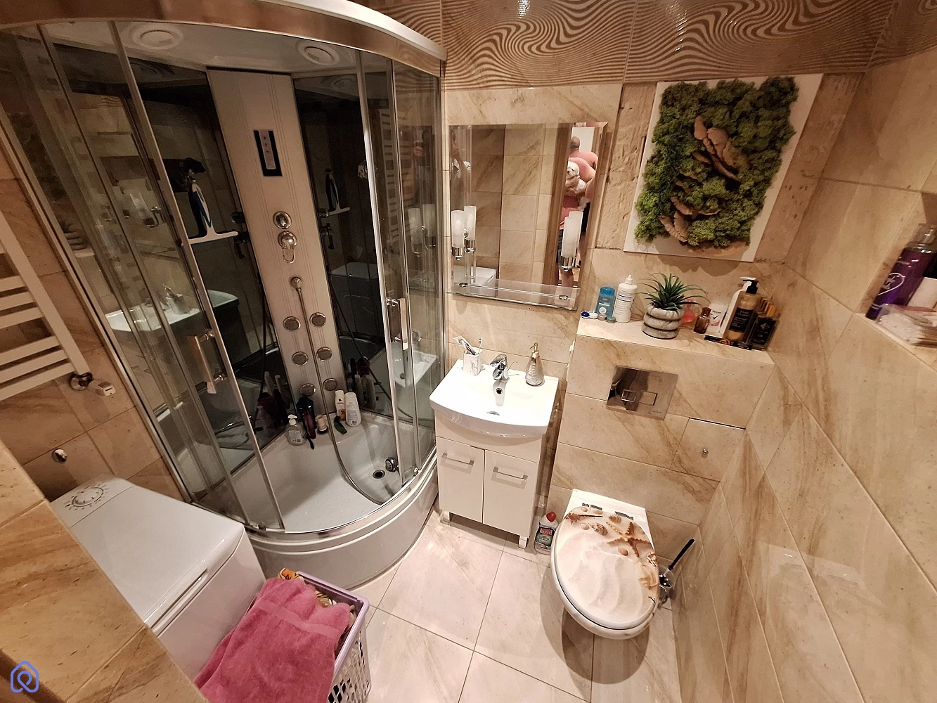 Nowa pralka. Łazienka oraz mieszkanie posiada system inteligentnego oświetlenia.