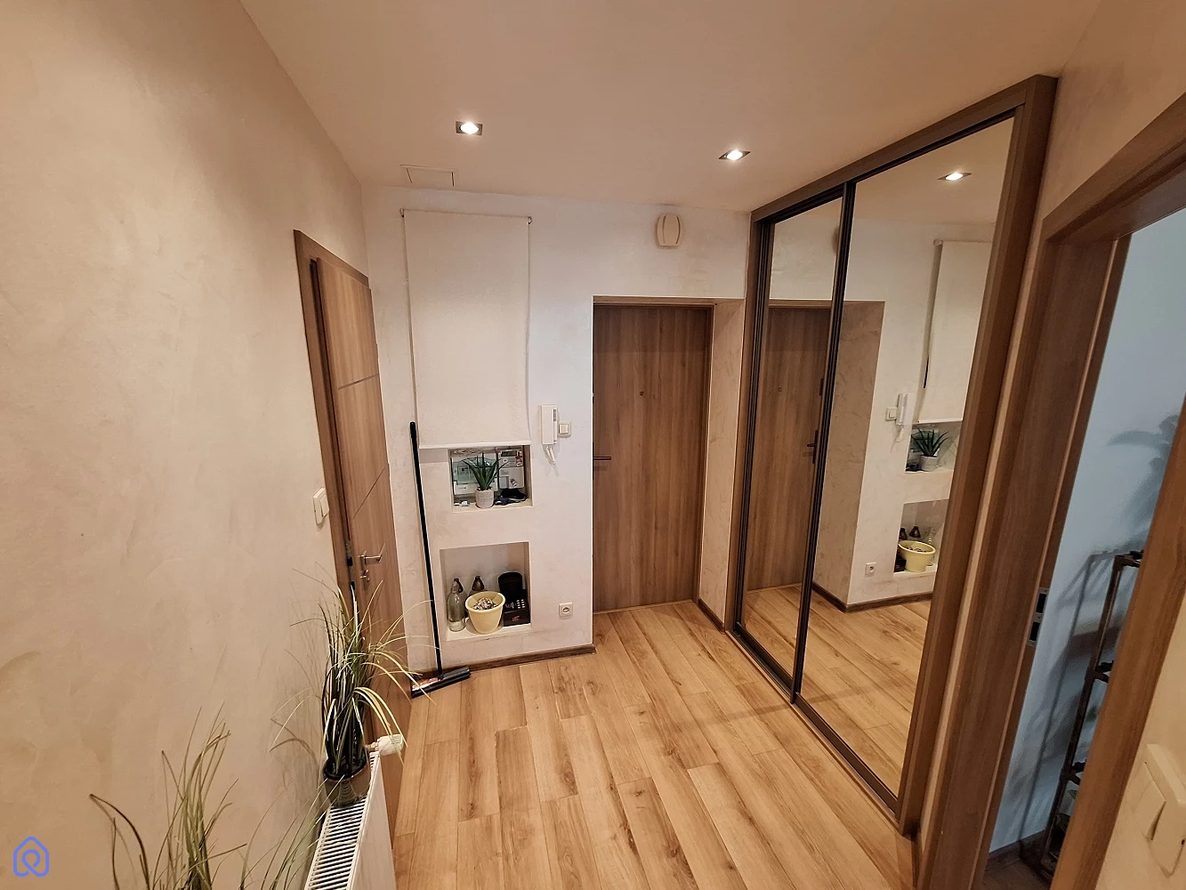 Duży przedpokój z bardzo pojemną szafą w zabudowie.