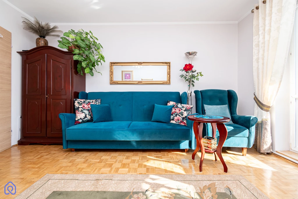 - jasny salon z wyjściem na balkon
