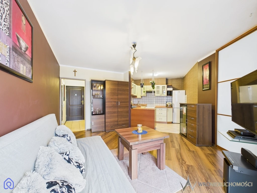 Układ mieszkania:salon z otwartą kuchnią i wyjściem na balkon,sypialnia oddzielona drzwiami przesuwnymi,łazienka z prysznicem,przedpokój,balkon,piwnica.