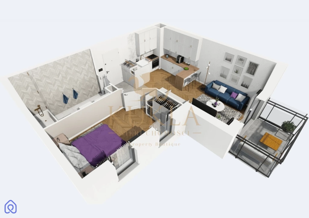 Powierzchnia 42.48 m2 - salon z aneksem kuchennym, sypialnia, łazienka, przedpokój.