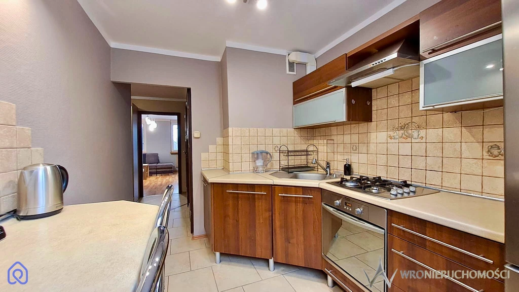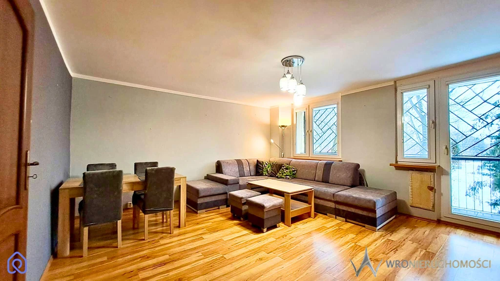 Układ pomieszczeń: 2 niezależne pokoje, osobna, jasna kuchnia, przedpokój z szafą, łazienka z prysznicem, osobne WC, duży balkon.