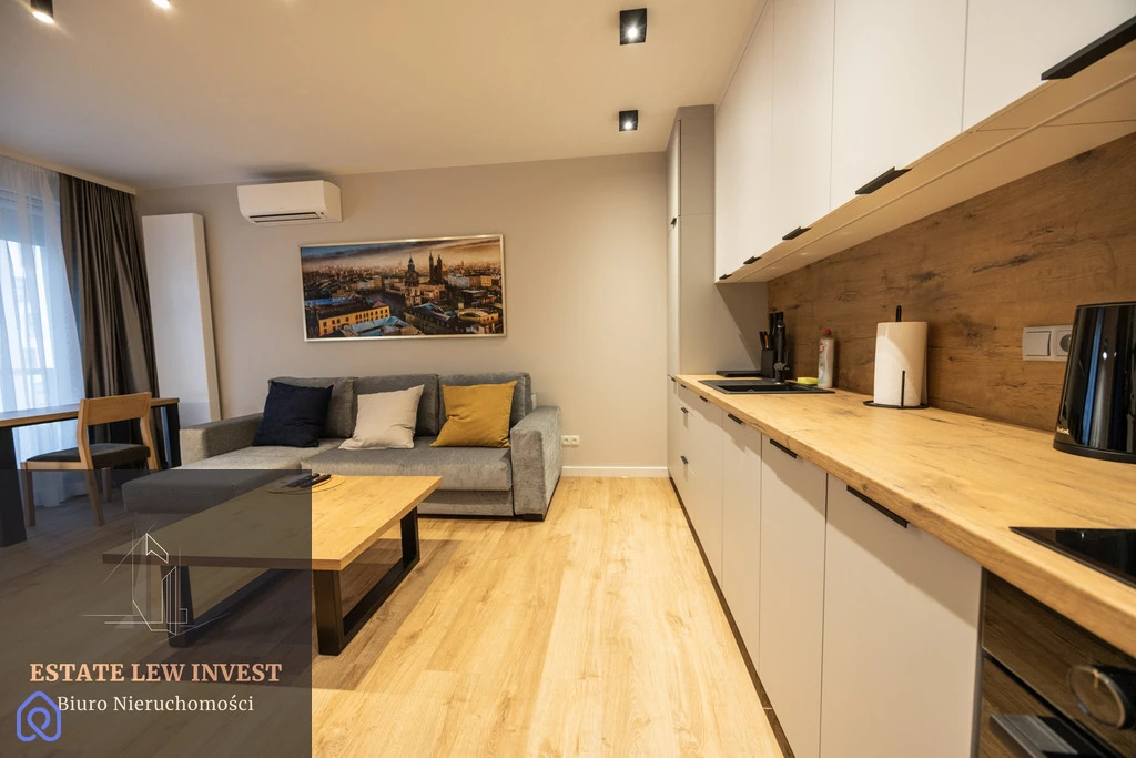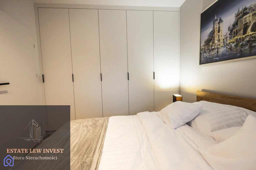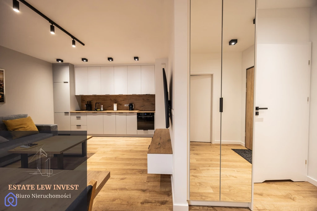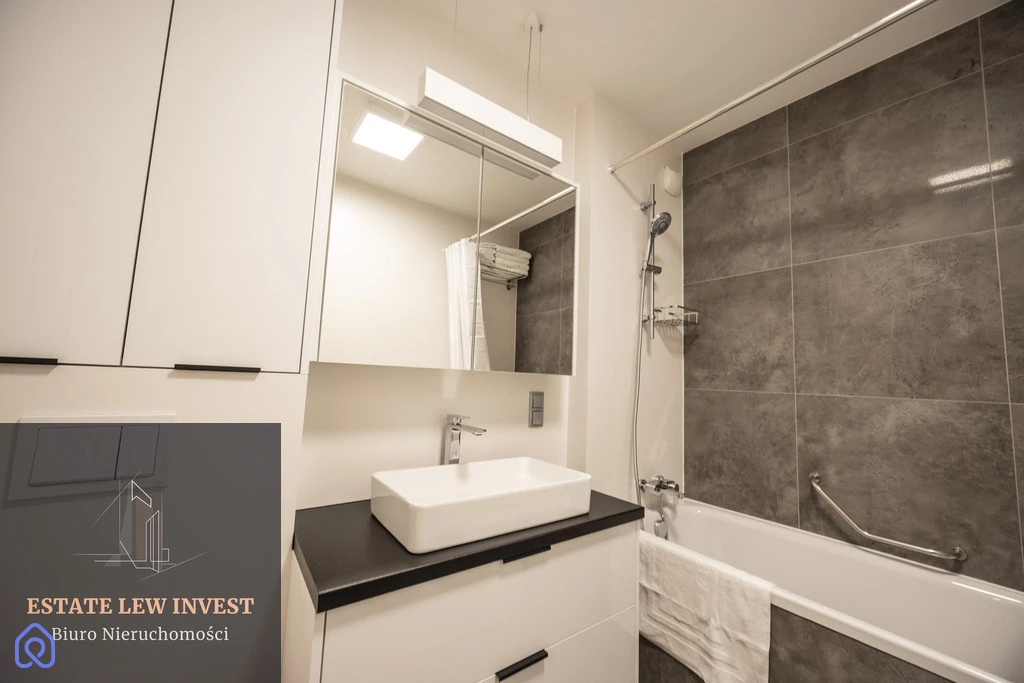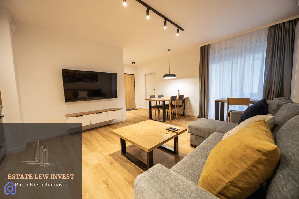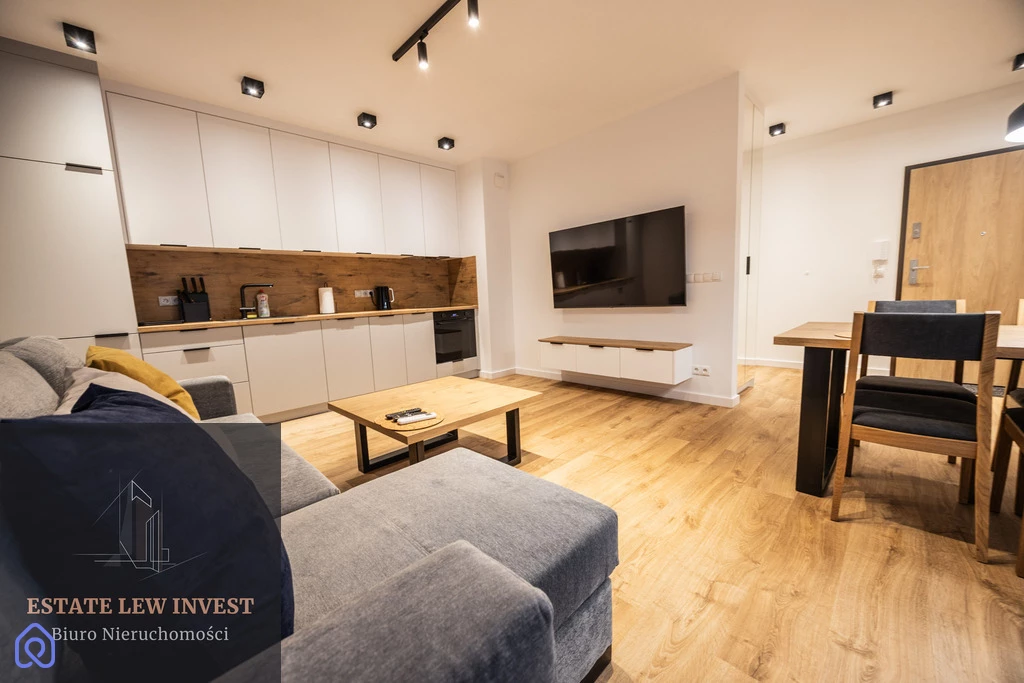 Mieszkanie składa się z przestronnego salonu z aneksem kuchennym, osobnej sypialni, eleganckiej łazienki oraz dużego balkonu z drewnianymi meblami. Jest w pełni umeblowane – meble na wymiar, wygodne łóżko, duża szafa oraz komplet wypoczynkowy. Wysokiej klasy sprzęt AGD obejmuje zmywarkę, piekarnik, lodówkę, pralkę BEKO, suszarkę Philips, a także drobne wyposażenie, takie jak odkurzacz, żelazko, sztućce i garnki Gerlach, naczynia, pościel i ręczniki. Mieszkanie posiada klimatyzację DAIKIN z funkcją nagrzewania oraz szybki internet w cenie. Istnieje możliwość wynajęcia miejsca postojowego w garażu podziemnym (250 zł/miesięcznie).