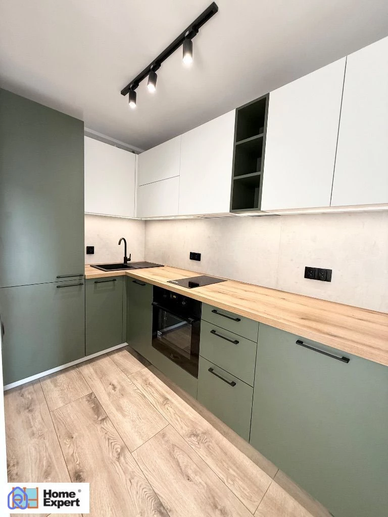 Kuchnia w pełni wyposażona - lodówka, zmywarka, piekarnik, płyta, okap, pralka. Sprzęty marek Samsung, Electrolux, Whirlpool w zabudowie.