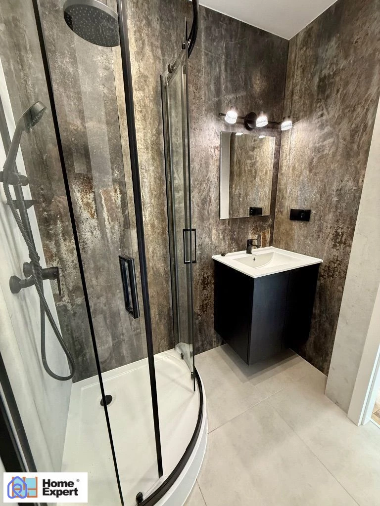 W łazience również meble wykonane na wymiar przez stolarza, na ścianach wielkoformatowe płyty z kolekcji Rocko Tiles.