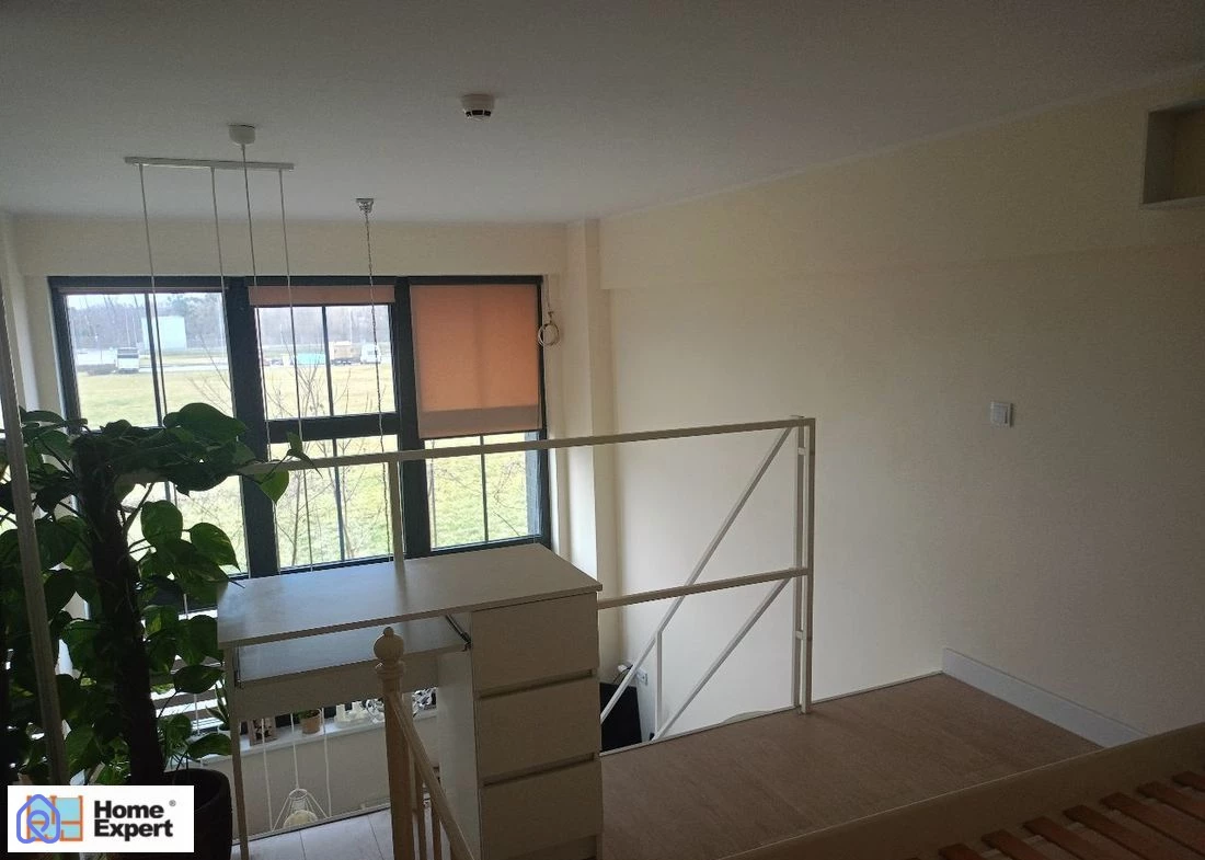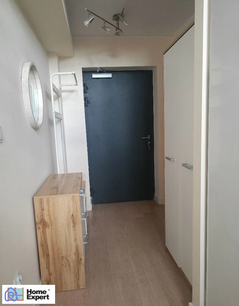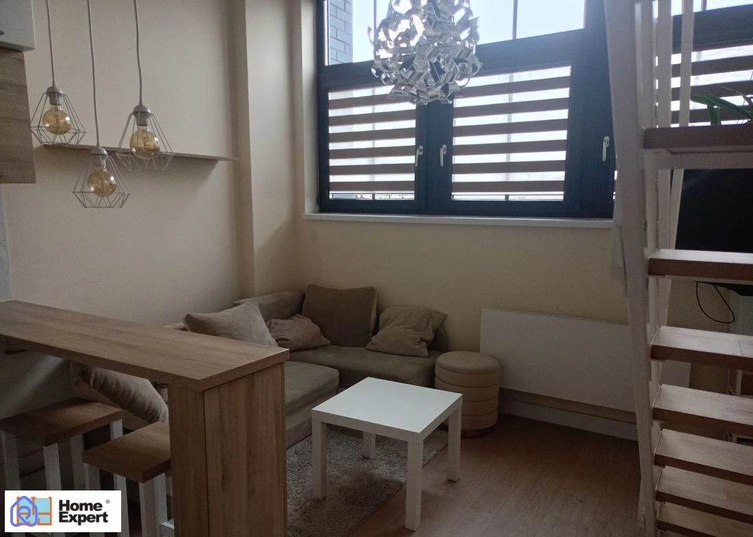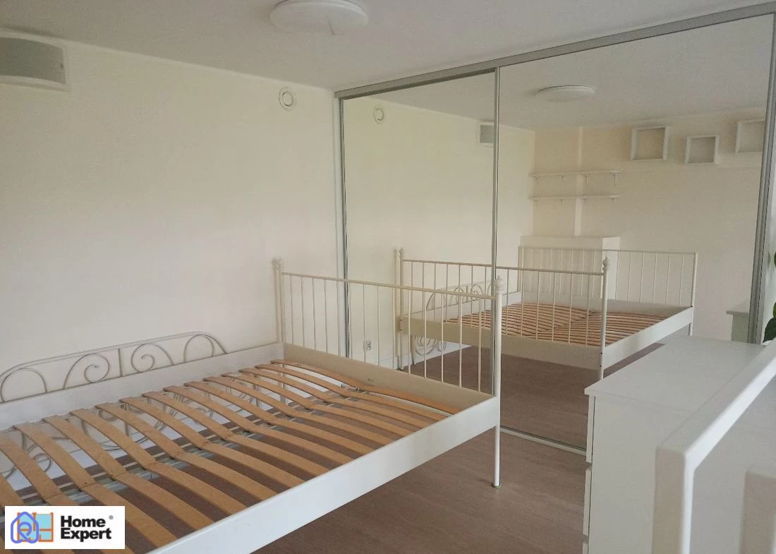 Składa się z salonu z aneksem kuchennym, łazienki, przedpokoju oraz antresoli z pojemną lustrzaną szafą.