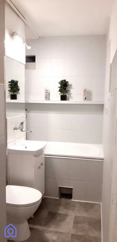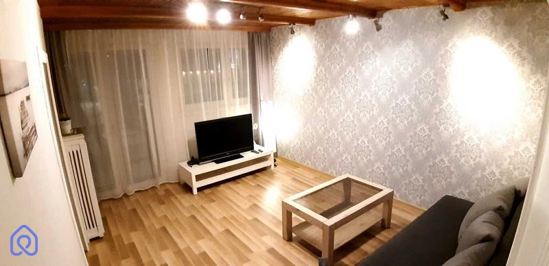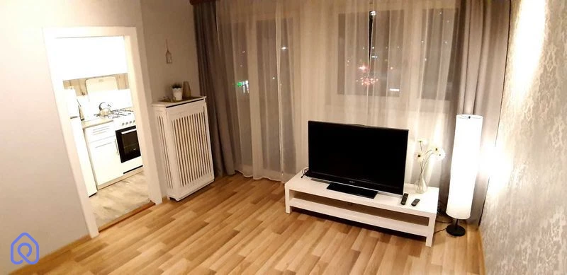 W pełni umeblowane mieszkanie obejmuje salon z wejściem do kuchni, sypialnię oraz łazienkę. Wyposażenie obejmuje m.in. pełną zabudowę kuchenną ze sprzętem AGD (lodówka, kuchenka gazowa), meble wypoczynkowe z ławą i stolikiem RTV, telewizorem o przekątnej 40 cali. Dodatkowo, w przedpokoju znajduje się pojemna szafa, a w łazience duże lustro, oświetlenie spotowe, WC, wanna, umywalka i pralka.