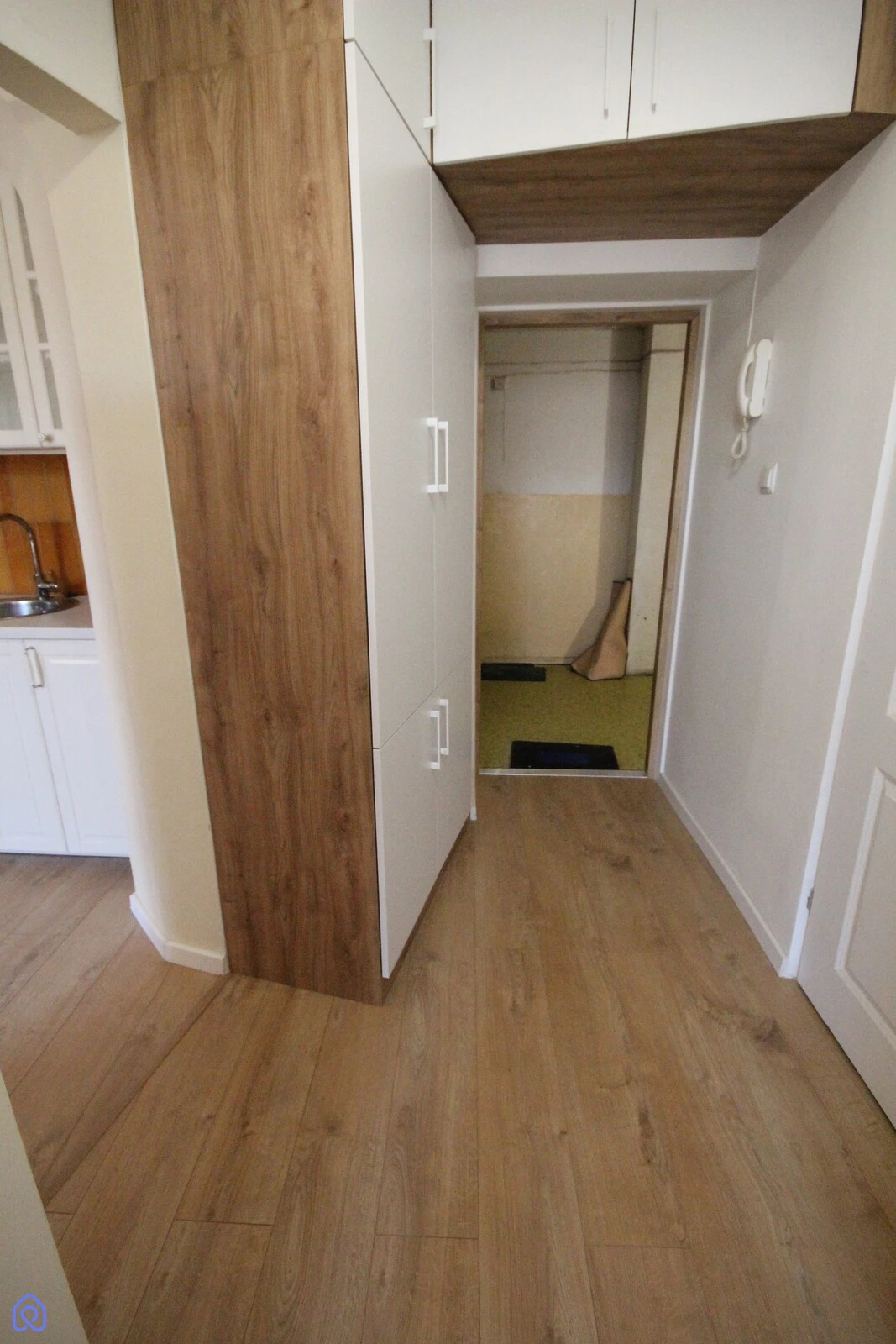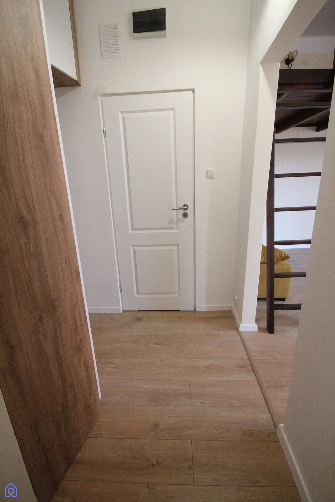 Antresola ok. 8 m2, na której znajduje się dodatkowa sypialnia (materac 1-osobowy) i pojemna szafka (ok. 2,5 m x 0,5m) Przedpokój z szafami w zabudowie, potężnym pawlaczem, domofon.