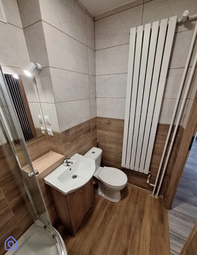 Łazienka - Jest gotowa do użytku. W centralnym miejscu jest umywalka z szafką z baterią umywalkową i lustrem. Po lewej stronie znajduje się prysznic z natryskiem, natomiast po lewej jest miejsce na pralkę. Natomiast po prawej stronie jest nowoczesna kształtem miska ustępowa.