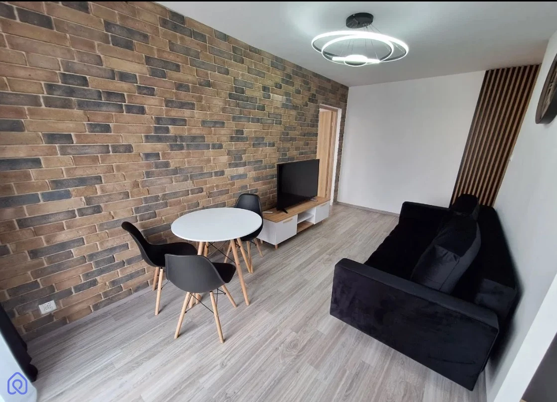 Salon - Nowoczesny idealnie wykonany w według projektu. Kamień dekoracyjny na ścianie wraz z zestawem wypoczynkowym w postaci kanapy rozkładanej oraz stołu z 4 krzesłami oraz szafką tv umożliwiają codzienny relax.
