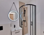 Łazienka urządzona została w nowoczesnym stylu, wyposażona w praktyczną kabinę prysznicową, nowoczesne kafle, szafkę z umywalką i miejsce na pralkę.