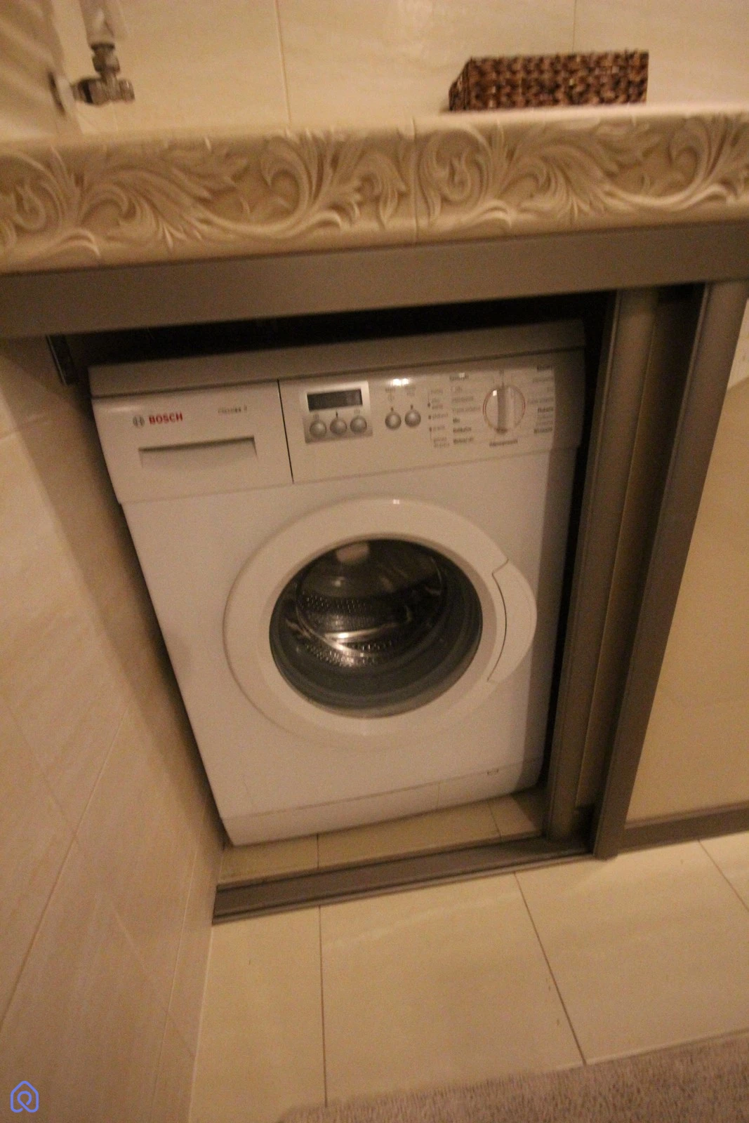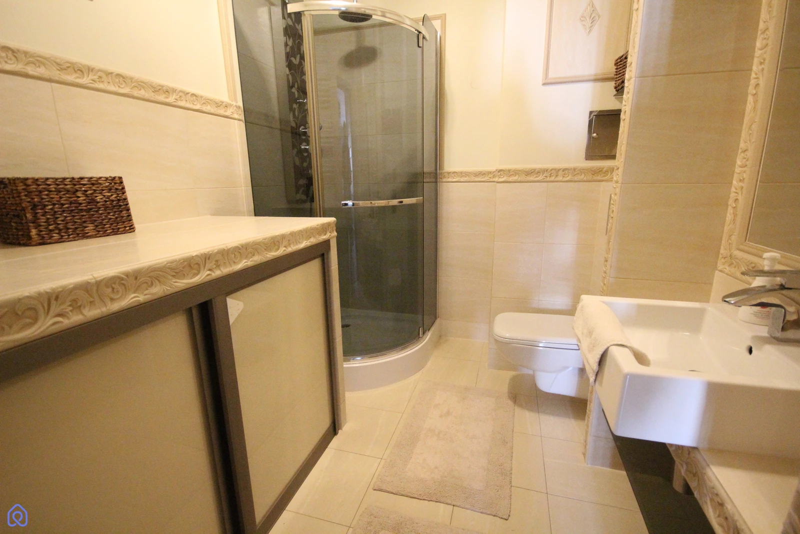 Łazienka z kabiną prysznicową (panel trójfunkcyjny z deszczownicą), zabudowaną w przesuwnej komodzie pralką (+ miejsce np. na suszarkę).