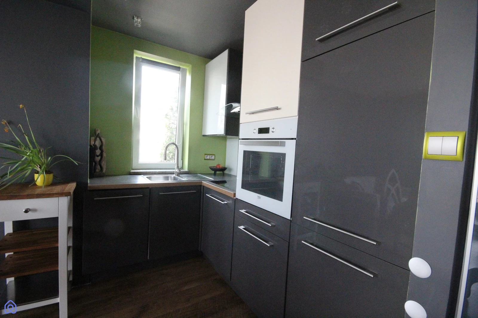 Mniejszy pokój z dużym oknem. Aneks kuchenny zawiera płytę indukcyjną, zmywarkę 40 cm, piekarnik, lodówkę, zamrażarkę, system szafek cargo.