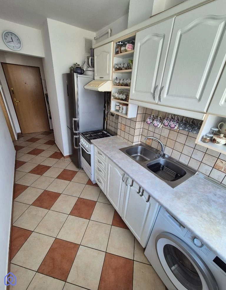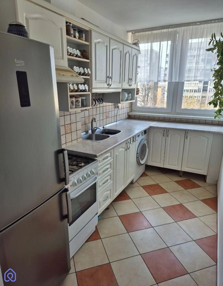 Osobnej kuchni z oknem (7,1 m²) – wyposażonej w sprzęt AGD (lodówka, pralka, kuchenka gazowa), gotowej do kulinarnych eksperymentów.