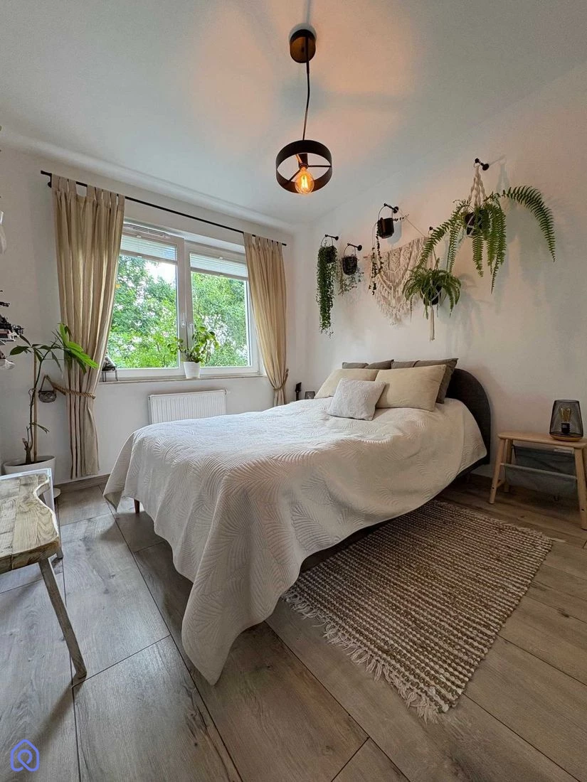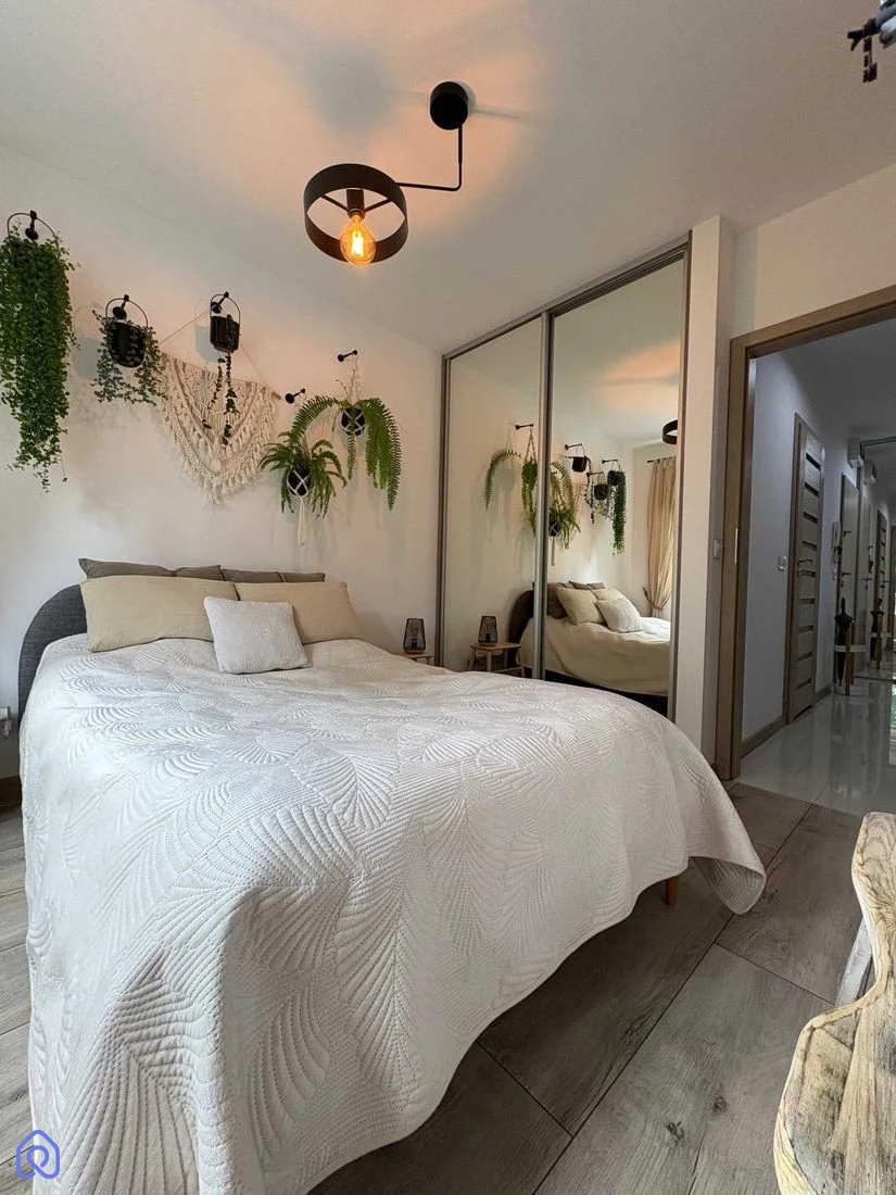 Sypialnia: duże łóżko, szafa w zabudowie, rolety-plisy