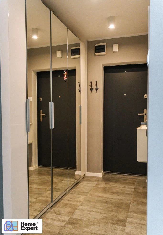 W przedpokoju zamontowaliśmy dwumetrowy zestaw szaf modułowych.