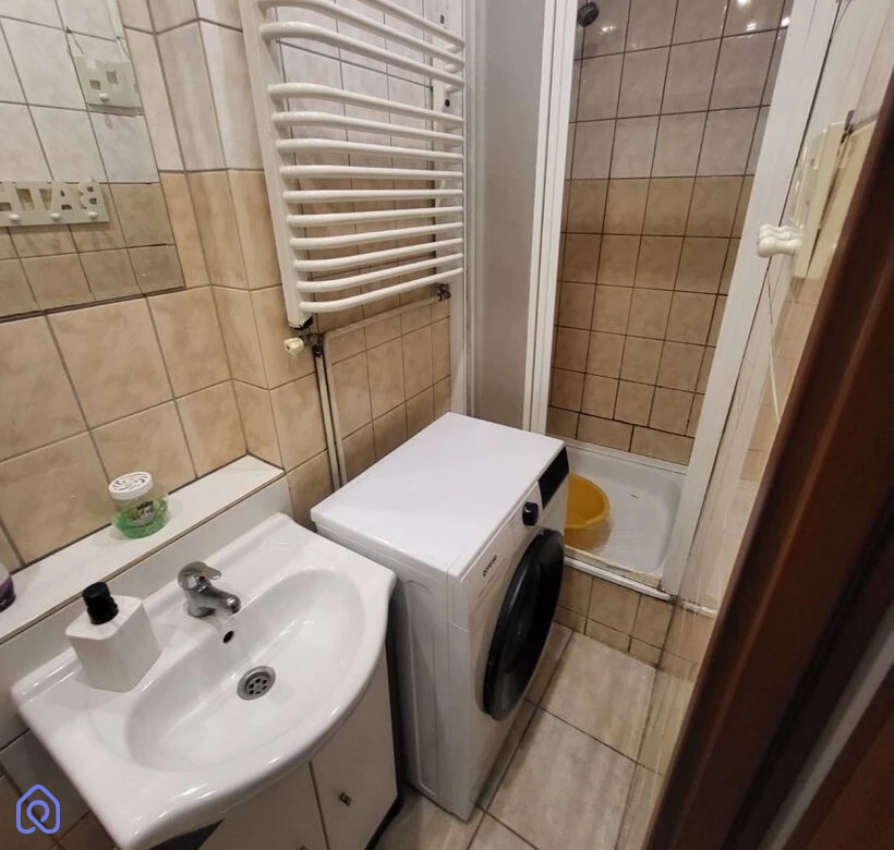 łazienka z prysznicem i nową pralką,