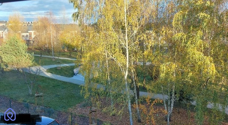 Z salonu rozciąga się przepiękny widok na nowoczesny park, co sprawia, że każde spojrzenie przez okno to czysta przyjemność, niezależnie od pory roku.