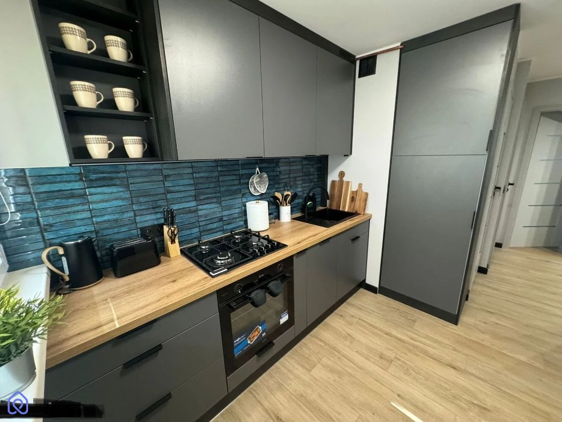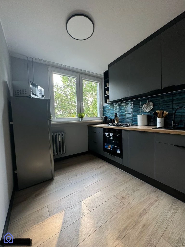 Kuchnia w pełni wyposażona w nowe meble, lodówkę, zmywarkę, mikrofalówkę, płytę gazową, piekarnik, podstawowe wyposażenie kuchenne, czajnik bezprzewodowy, toster i wiele innych.