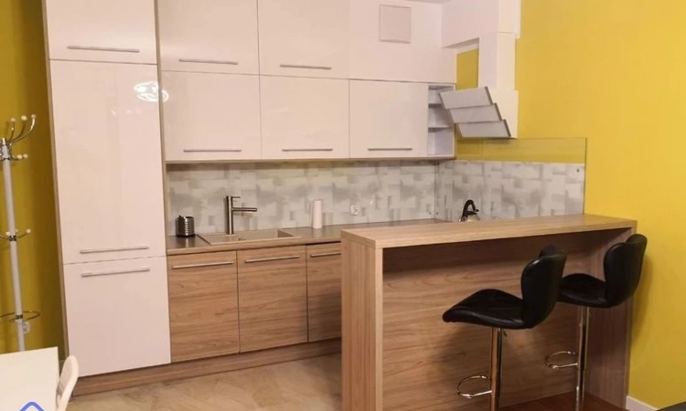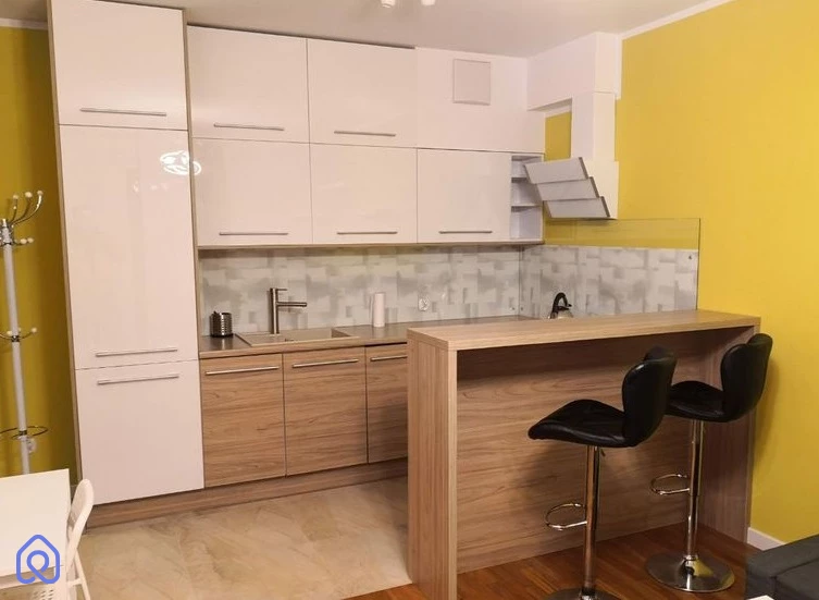 Kuchnia jest funkcjonalna i wygodna, na wymiar, wyposażona w sprzęt AGD (plyta indukcyjna, piekarnik, zmywarka, lodówka, okap).