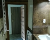 Łazienka posiada zabudowę na wymiar pod pralkę i szafę, oraz podwieszone oświetlenie.