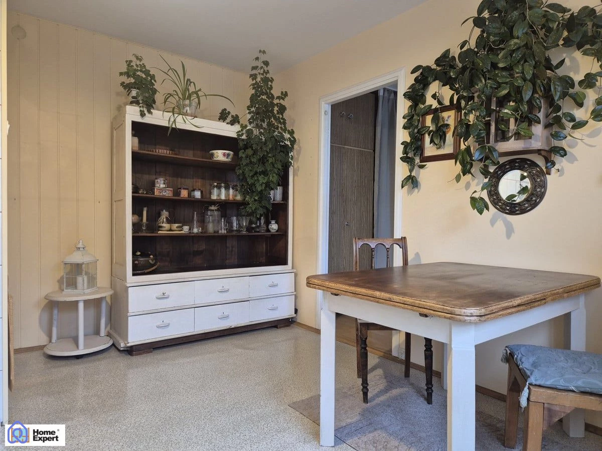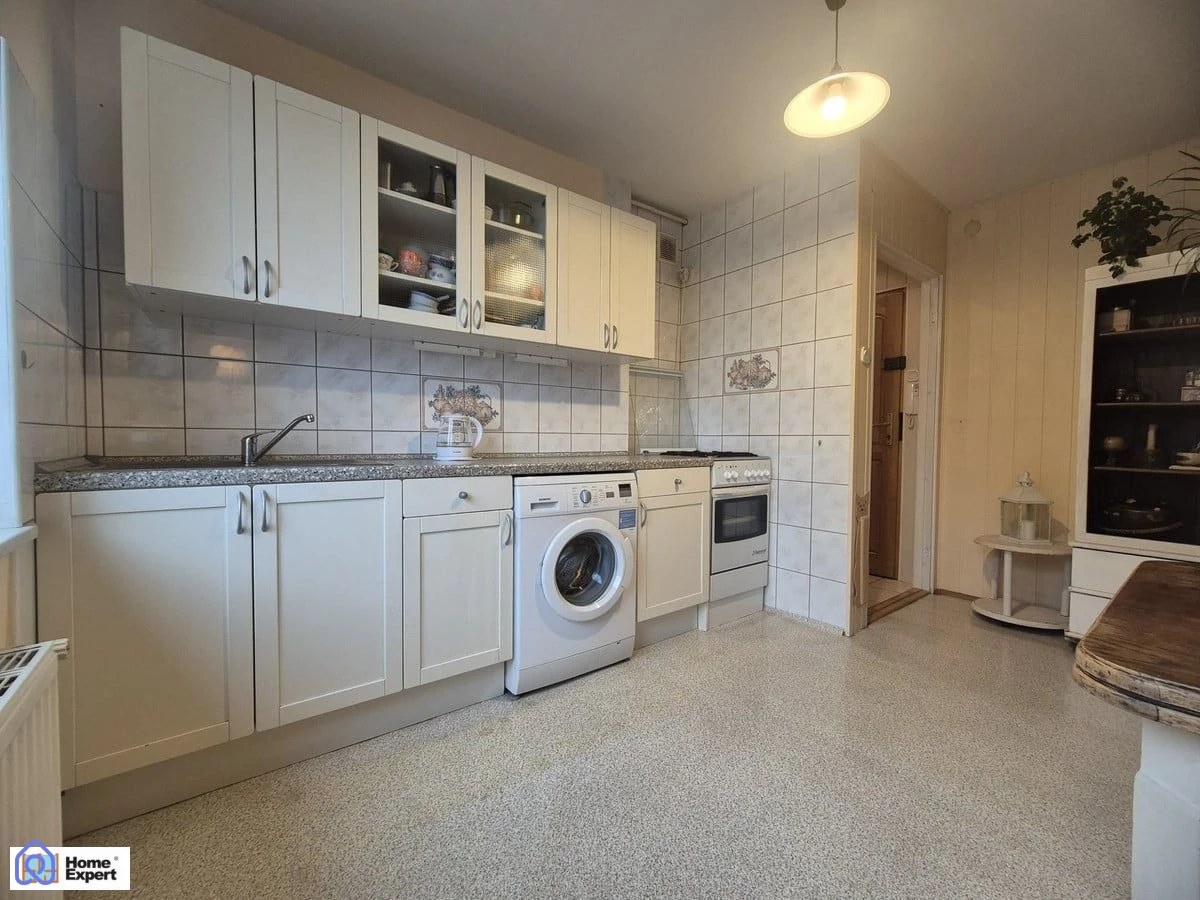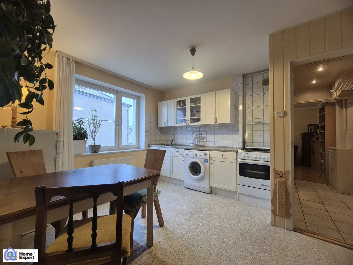 Kuchnia z jadalnią (12 m²) – funkcjonalna, ze sprzętem AGD: lodówka, piekarnik gazowy, kuchenka gazowa, pralka
