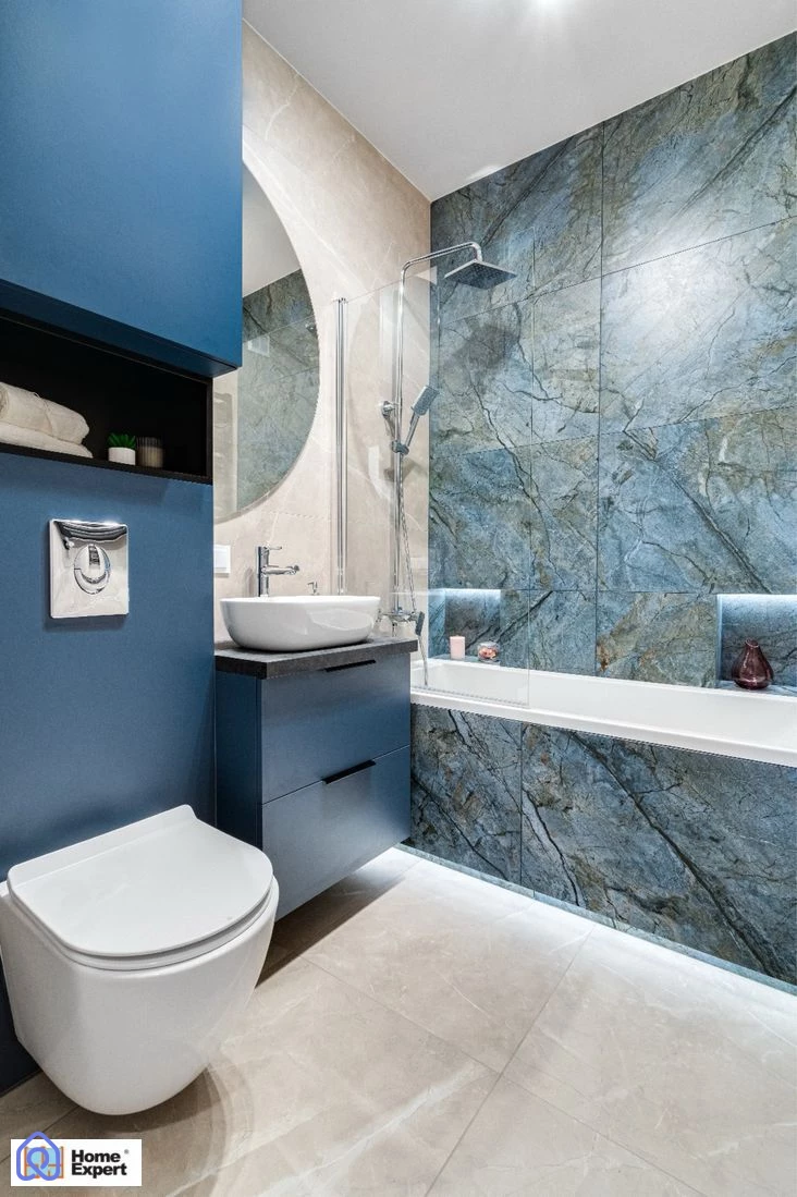 łazienki z wanną i prysznicem, wykończonej wysokiej jakości materiałami.